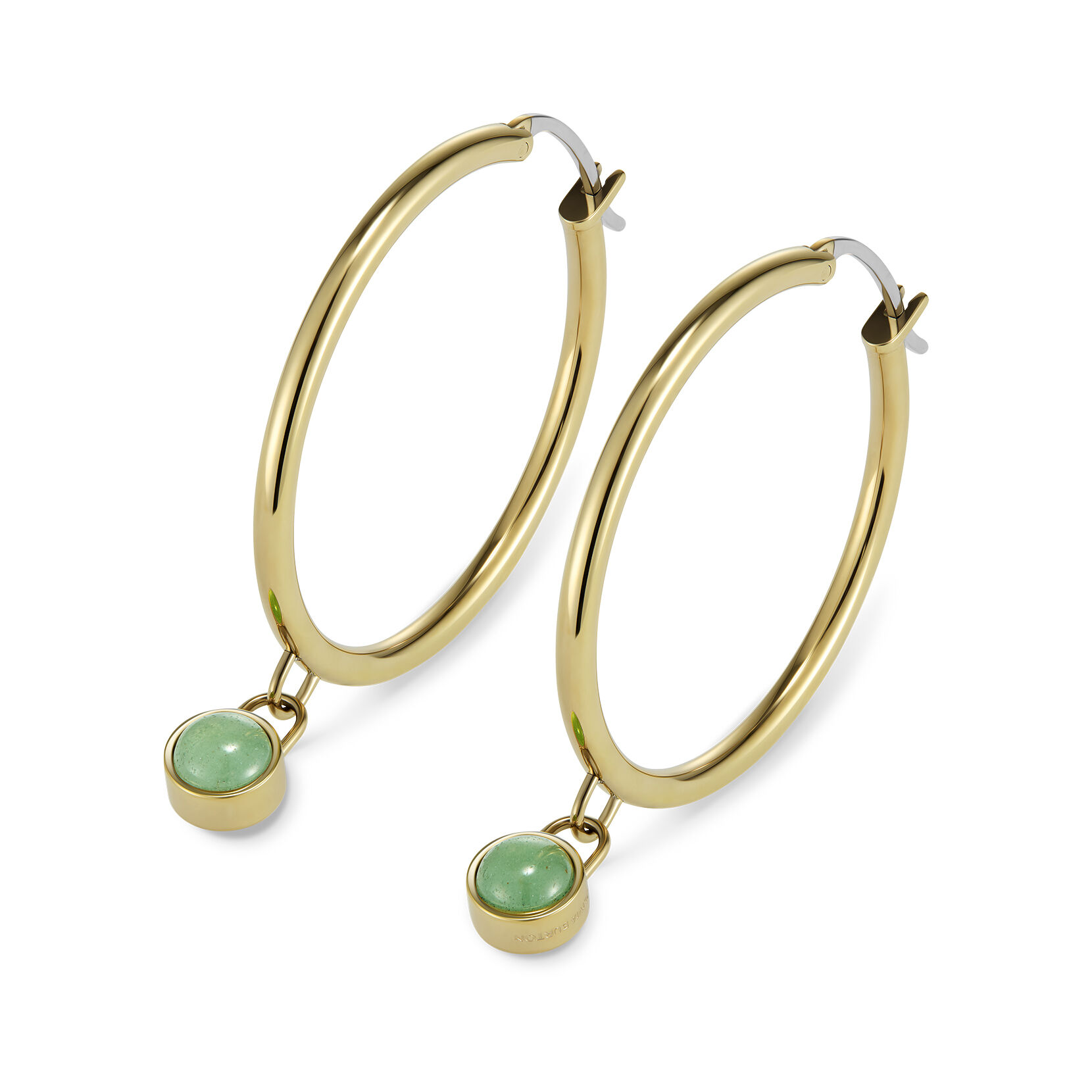 Channel the power and beauty of Aventurine with our collection of semi-precious gemstones. These statement gold-plated hoops feature cabochon-set Green Aventurine gemstones polished to perfection. Believed to bring luck and prosperity, these meaningful earrings make a gorgeous gift and bring color to any jewelry wardrobe.
