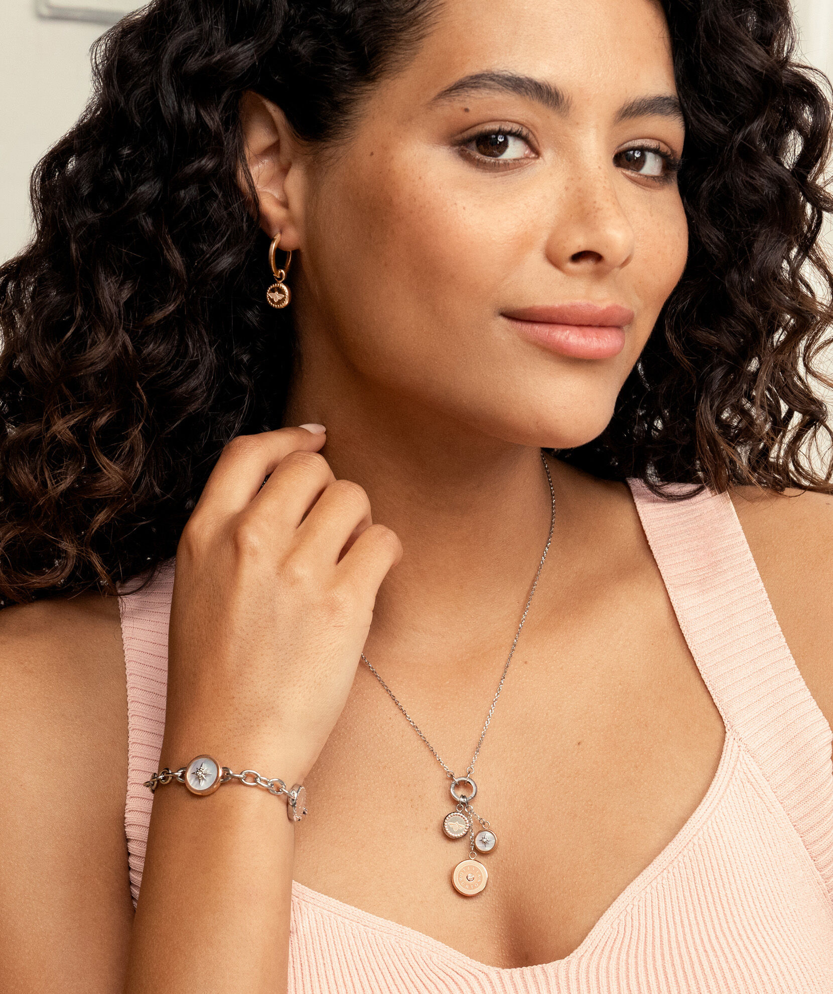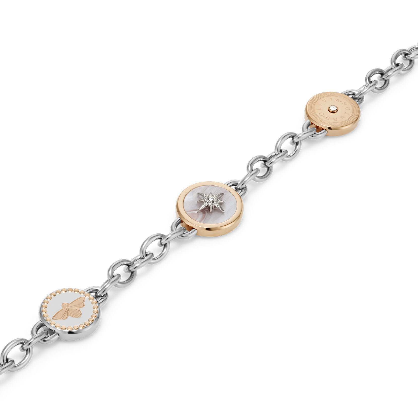 Prepare to be charmed by our vintage-inspired collection. This two-tone silver-tone and rose gold-plated bracelet features a trio of beautifully detailed charms . Each charm represents a treasured motif for our brand, including a playful bee, a North Star set on faux mother of pearl and a crystal-set disc with ribbon etching. Paired with a heavy-link gold-plated chain, this can make a statement o
