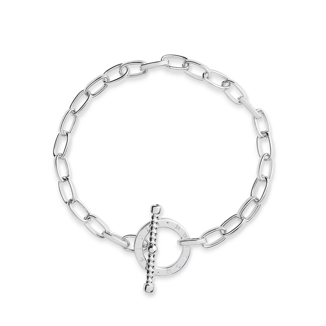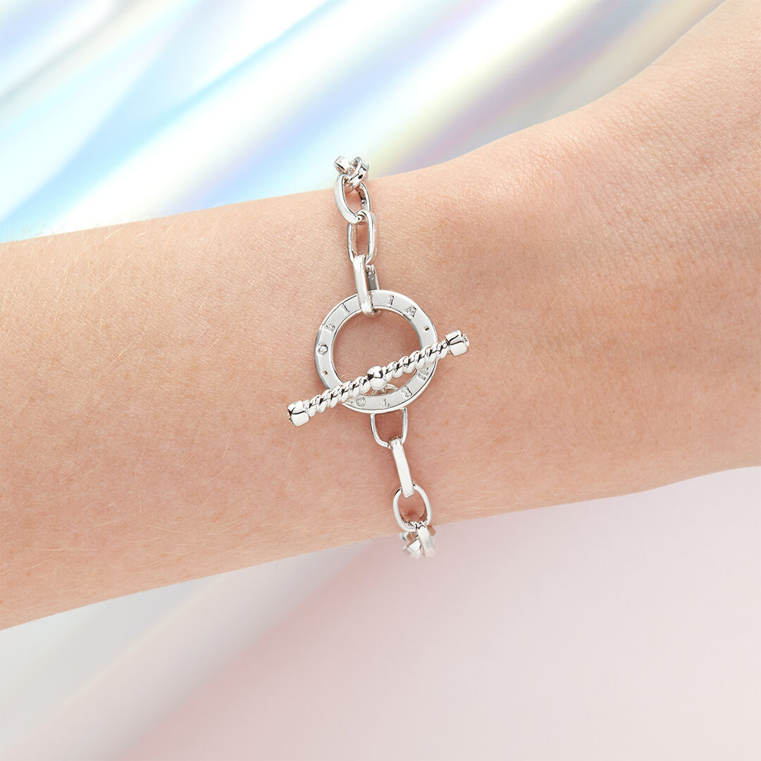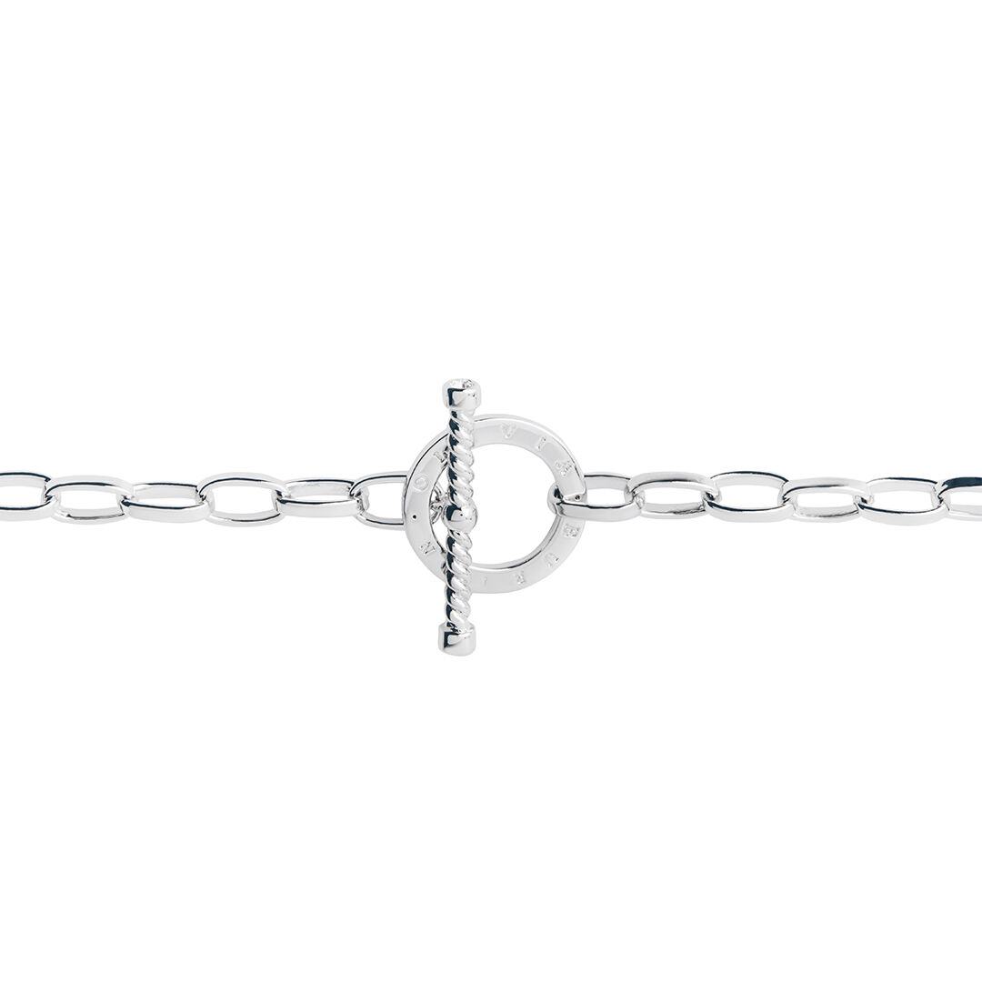 This charming silver-plated bracelet withCrystal details is just as classic as it is statement-making. A bold linking chain fastens with an embellished T-bar design. A twisted rope bar links through a ring, embossed with our signature branding. Pair this piece with the matching necklace for a unique set, or gift for a loved one, that’s guaranteed to WOW.