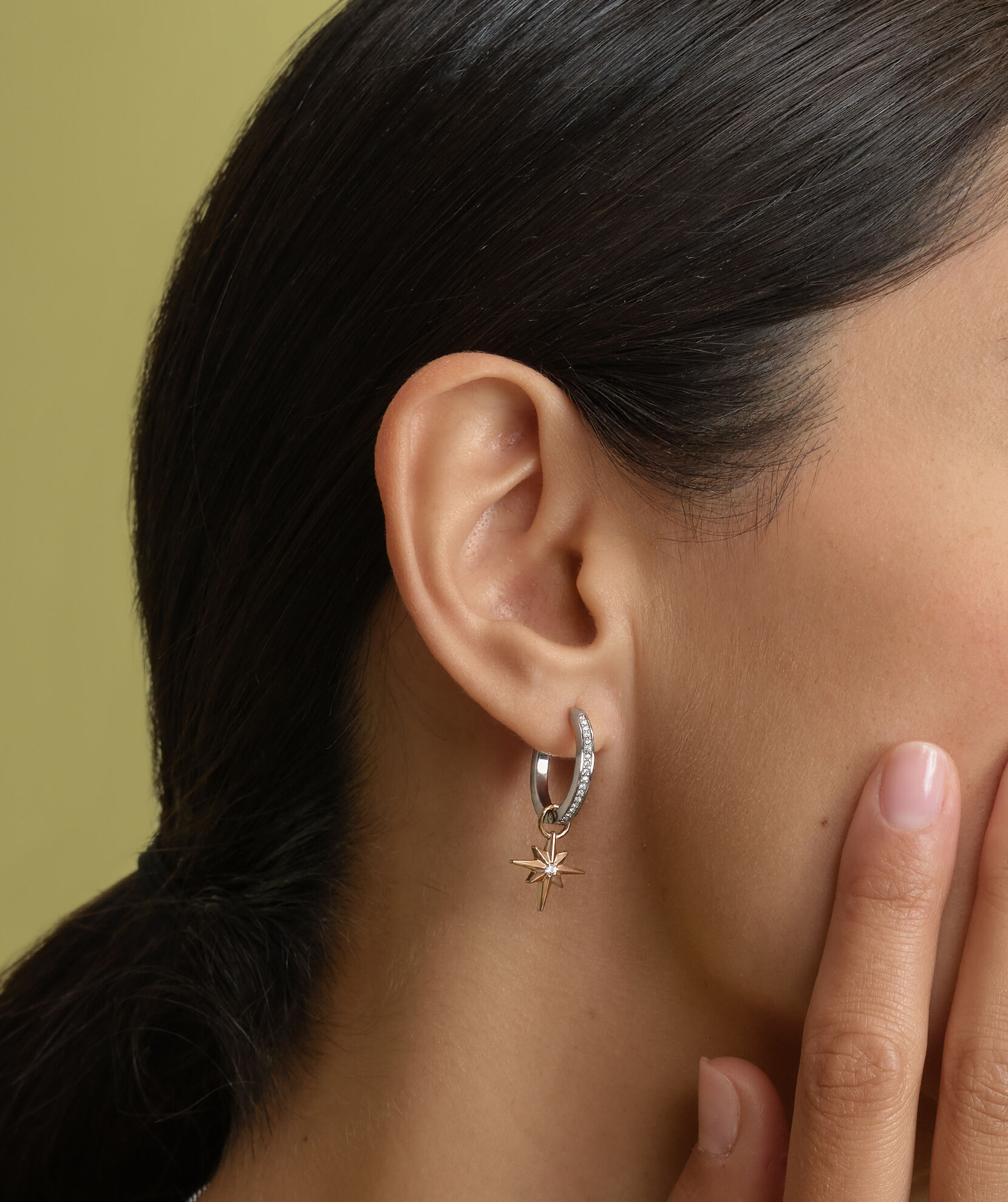 Bring the night sky to your everyday look with our customizable Huggie earrings. These delicate hoops in a silver finish are studded with crystals and feature rose gold North Star and crescent moon charms. Want a sleek evening look? The charms are removable giving you more ways to wear.