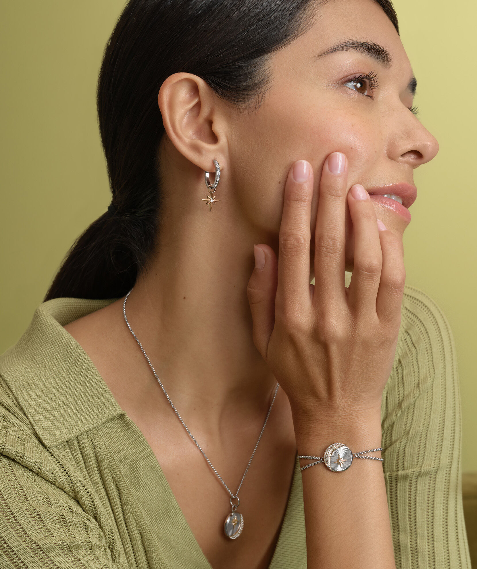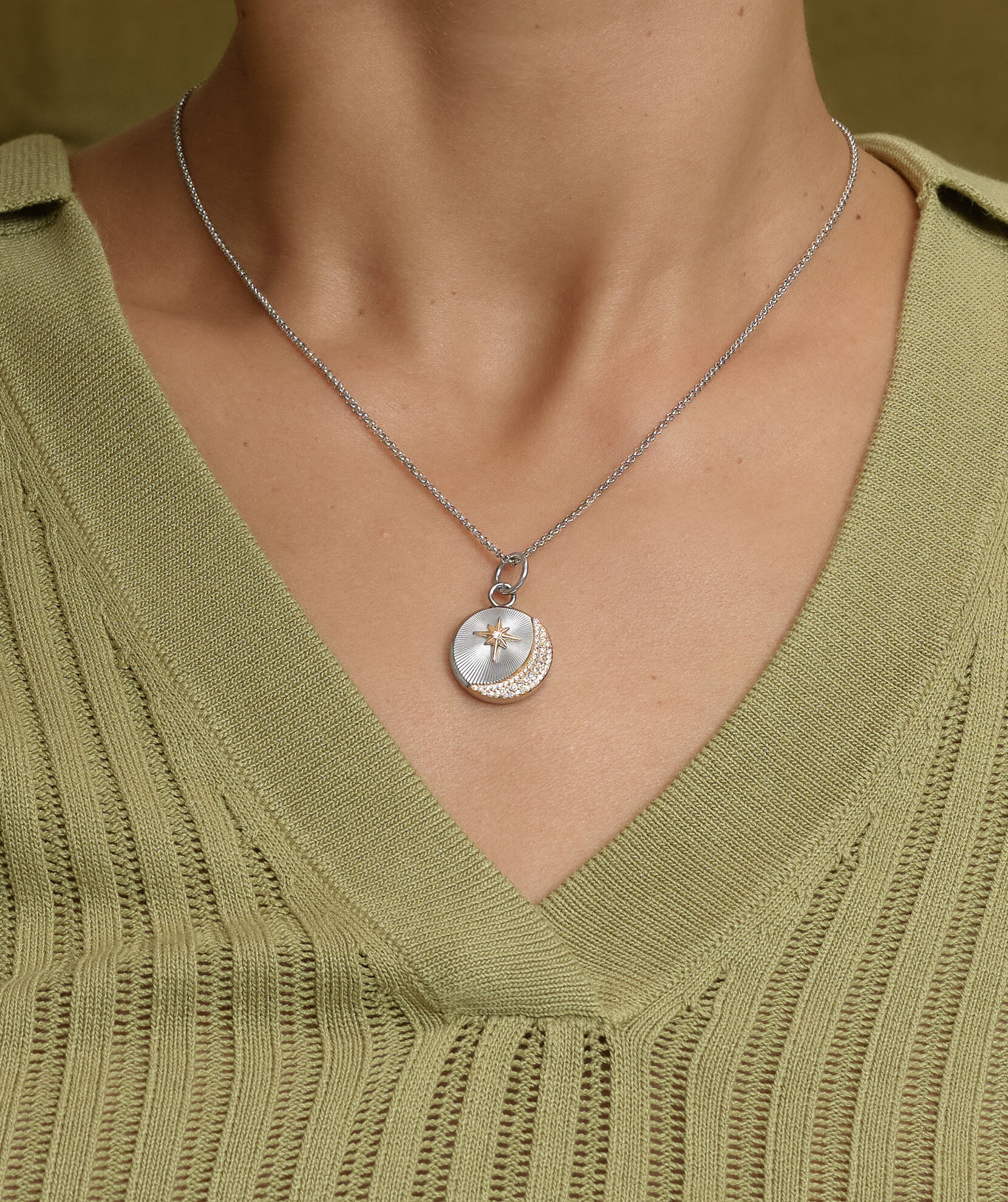 Our celestial-inspired necklace brings together the sun, moon and stars in one beautiful piece. This stunning silver-tone pendant is emblazoned with our signature North Star in rose gold for guidance and wisdom. The curve of the crescent moon is picked out in delicate pavé crystals for a touch of sparkle whilst the sunburst texture provides a radiant backdrop. Teamed with a classic chain, it’s the perfect way to carry the cosmos wherever you go.