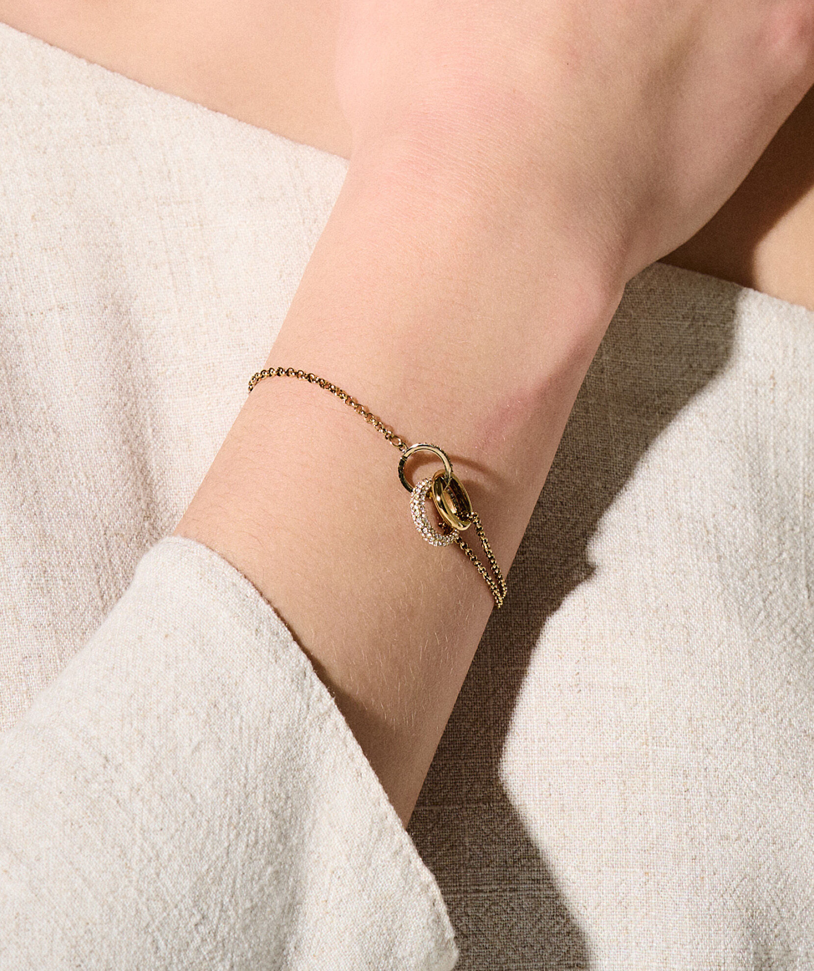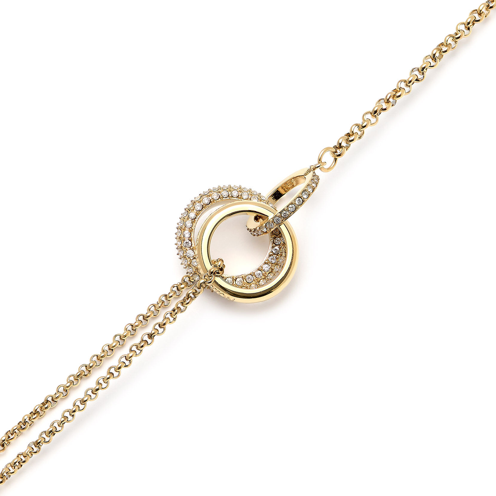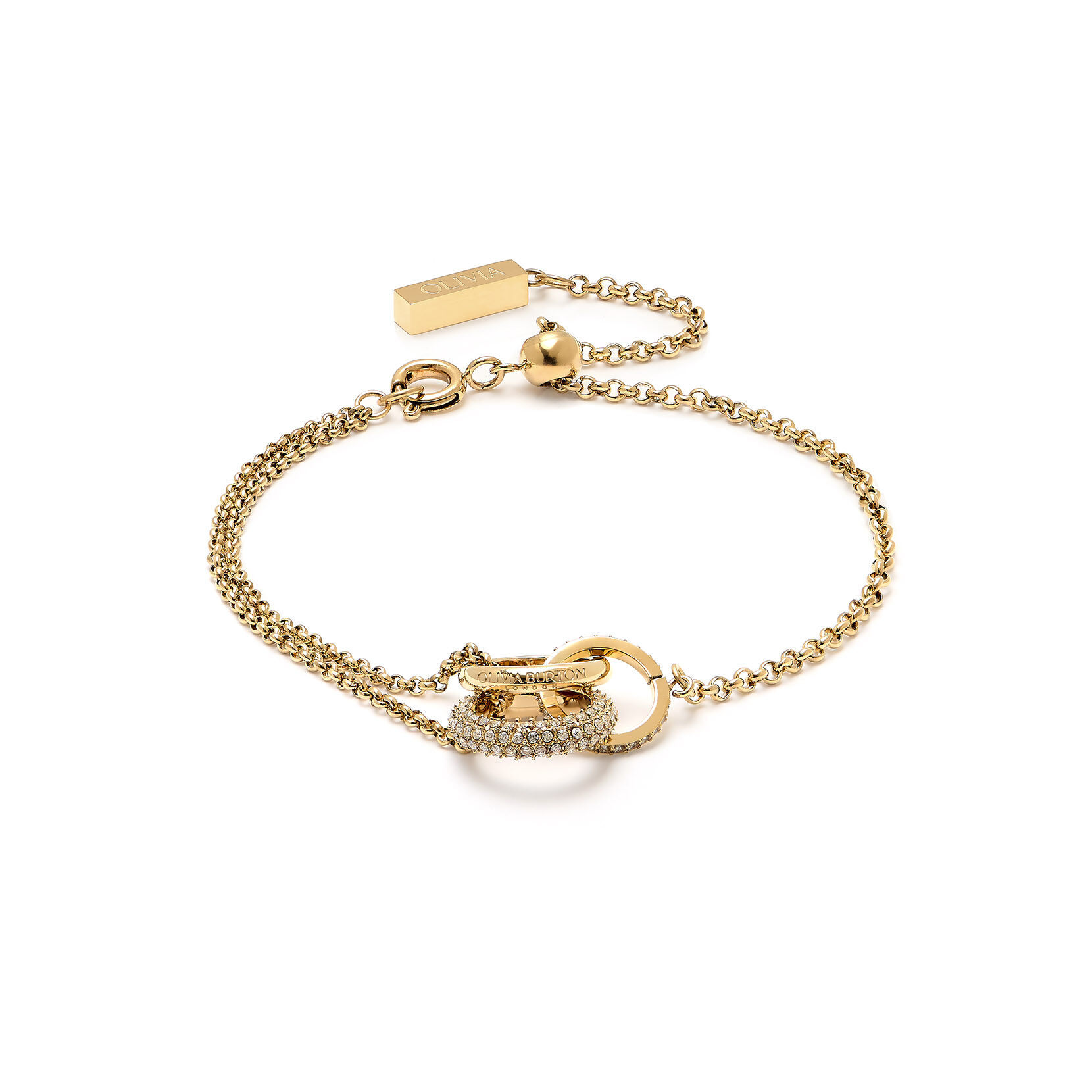 From our Classic Entwine range, this interlinking bracelet symbolises balance, harmony & tranquillity. The elegant design combines a gold-plated ring with the Olivia Burton signature and two crystal-embellished circles entwined, creating a sense of balance. A meaningful gift or personal token of inner harmony.