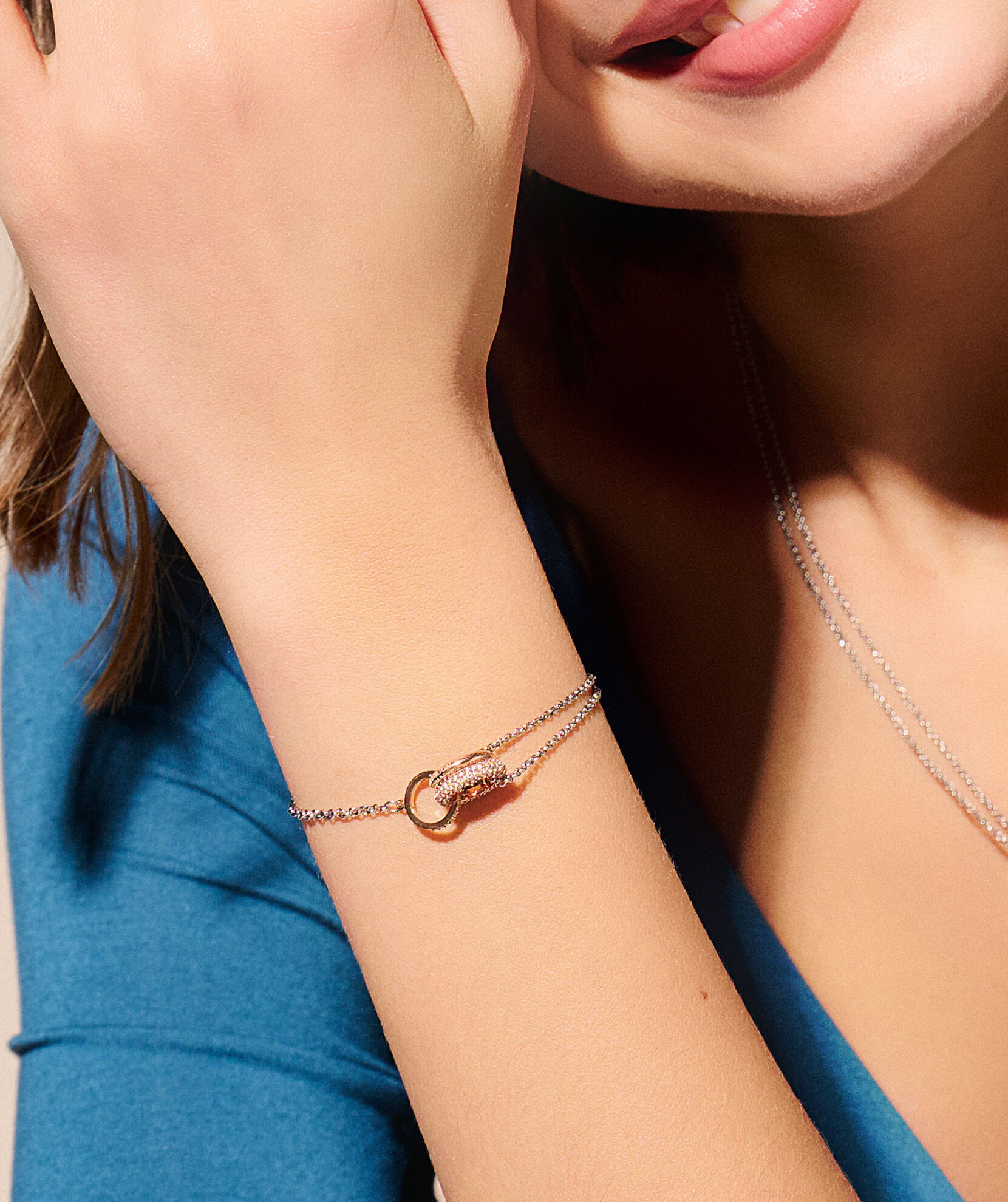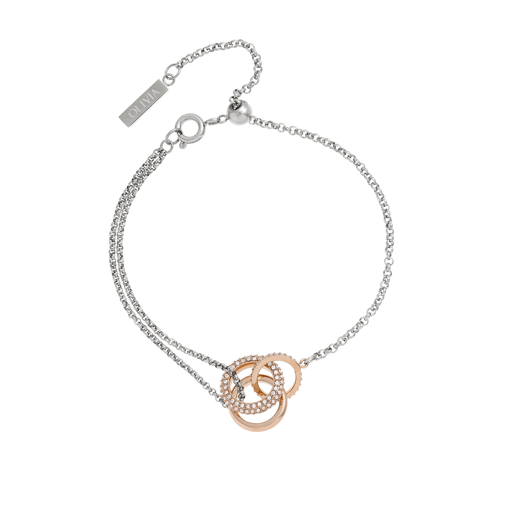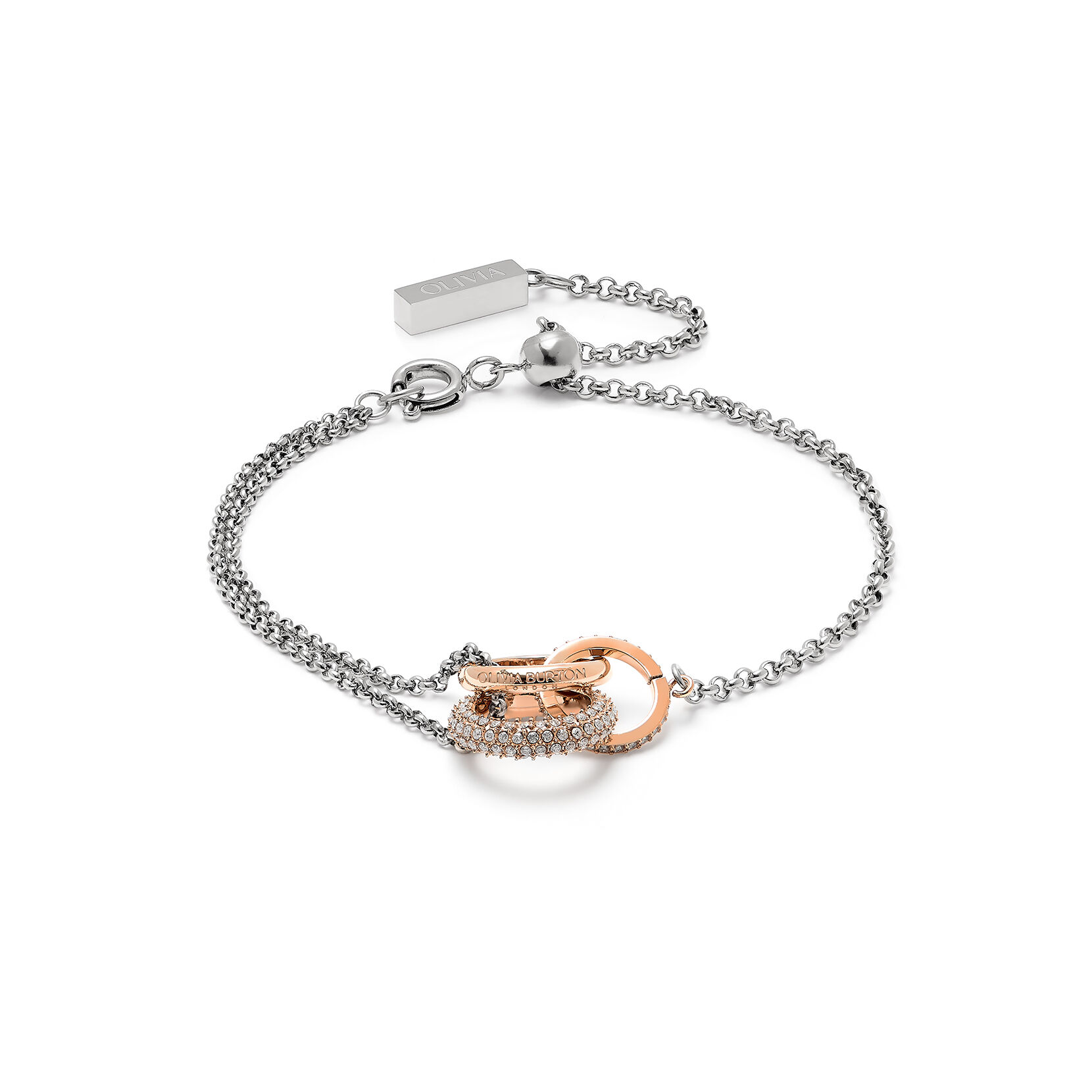 From our Classic Entwine range, this interlinking bracelet symbolises balance, harmony & tranquillity. The elegant design combines a rose gold-plated ring with the Olivia Burton signature and two crystal-embellished circles entwined, creating a sense of balance. A meaningful gift or personal token of inner harmony.