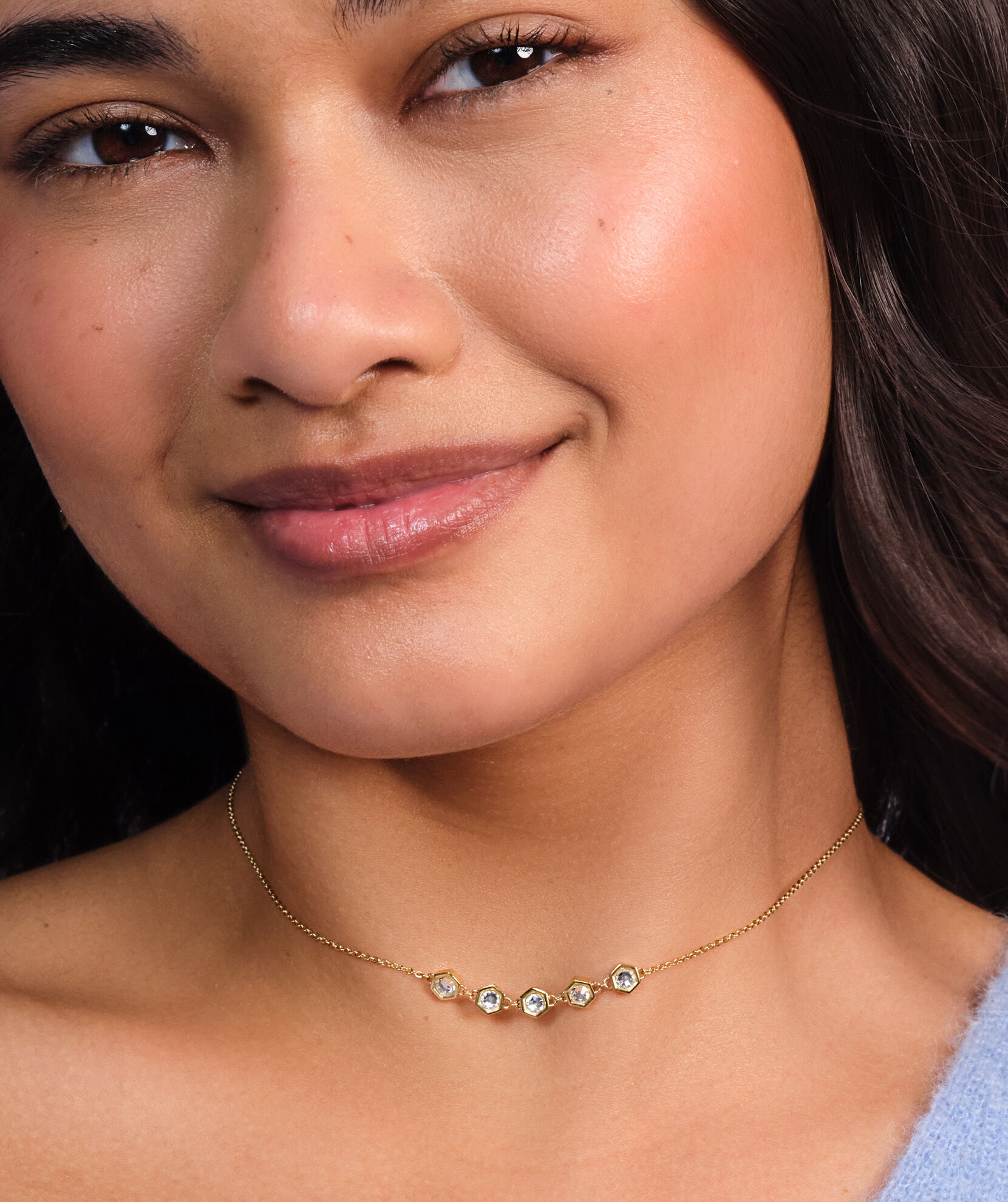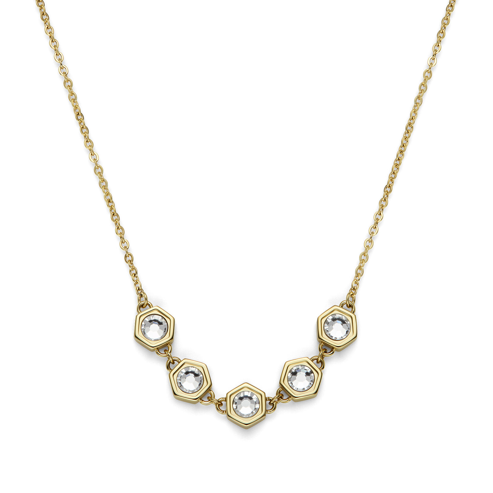 Our Ever stacked jewelry collection continues to grow with designs inspired by some of our best-loved motifs. This delicate gold-plated necklace features a series of hexagonal crystal-set charms inspired by the honeycomb. Each piece has a generous extender to help create the perfect stack. Why not try pairing gold and silver for a mixed-metal look?