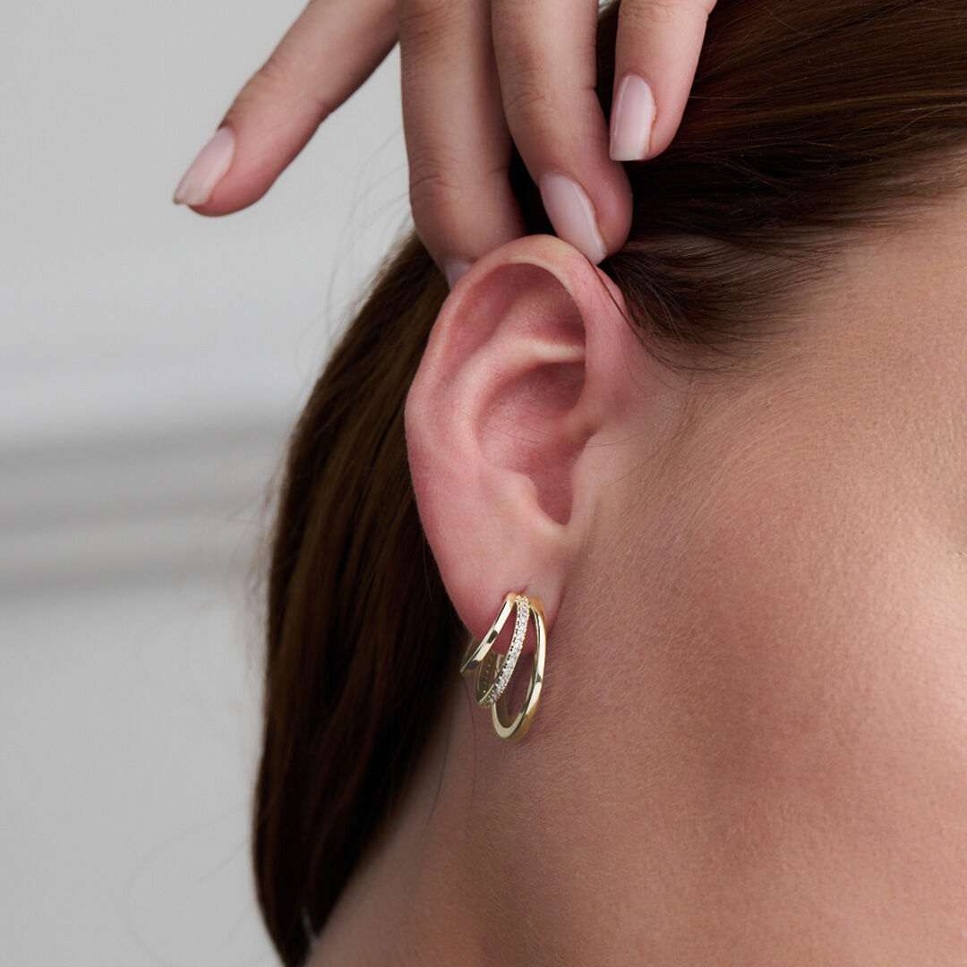The ultimate stacking hack: our Multi Loop Hoops are perfect for building up your jewelry looks. Each earring features a structured triple hoop design, with three 18K gold-plated hoops in a gradient of lengths for a stacked effect. The central hoop has been embellished with subtle cubic zirconia stones to add some textured sparkle. Timeless, chic and just waiting to be added to your collection.