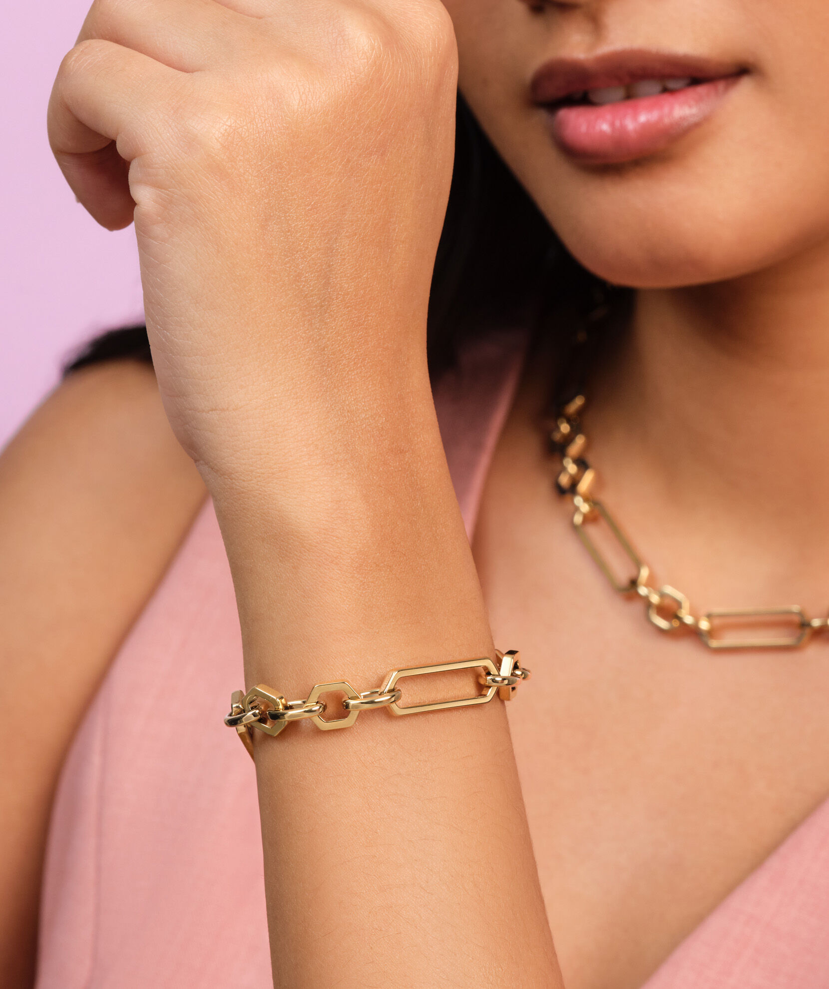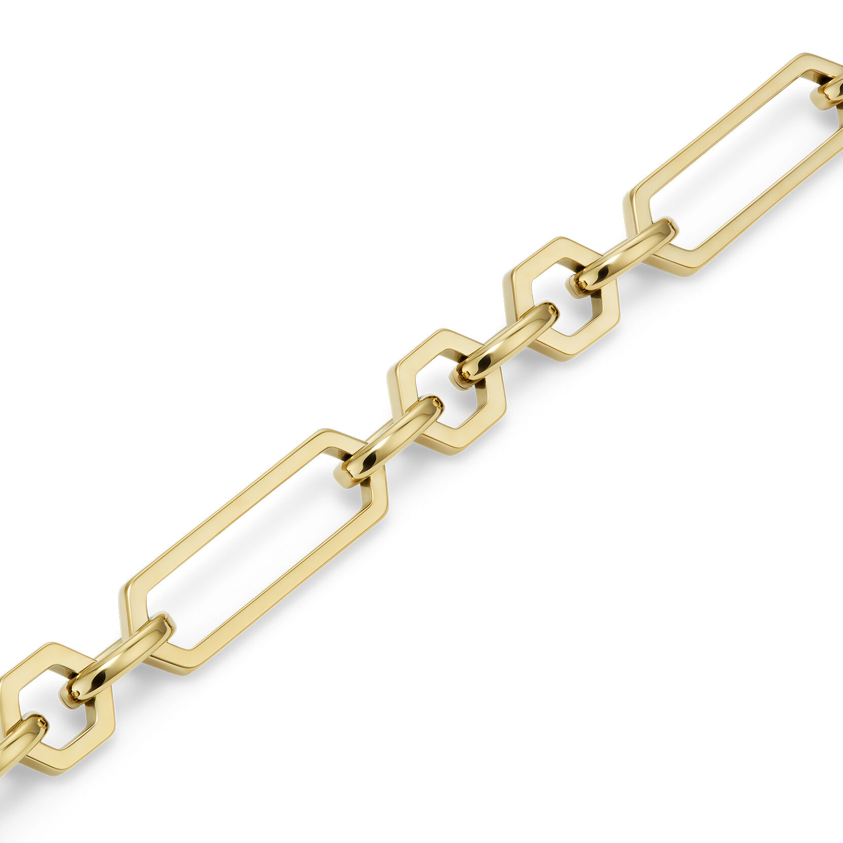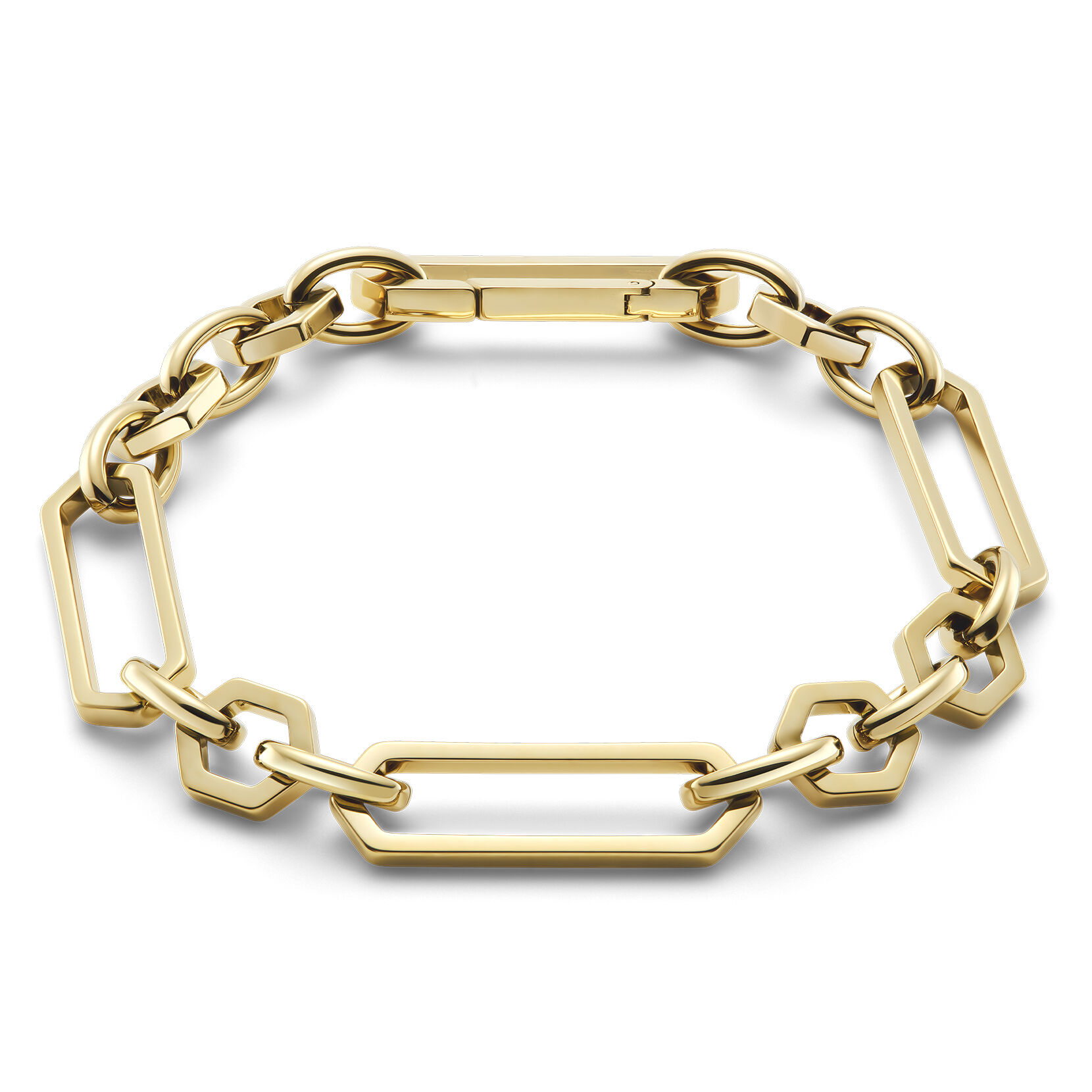This chunky bracelet is a stylish staple. The heavy-weight chain is comprised of gold-plated links inspired by the honeycomb. An invisible clasp makes for seamless wearing. The perfect way to tap into the statement jewellery trend, this is one collection you’ll wonder how you ever lived without.