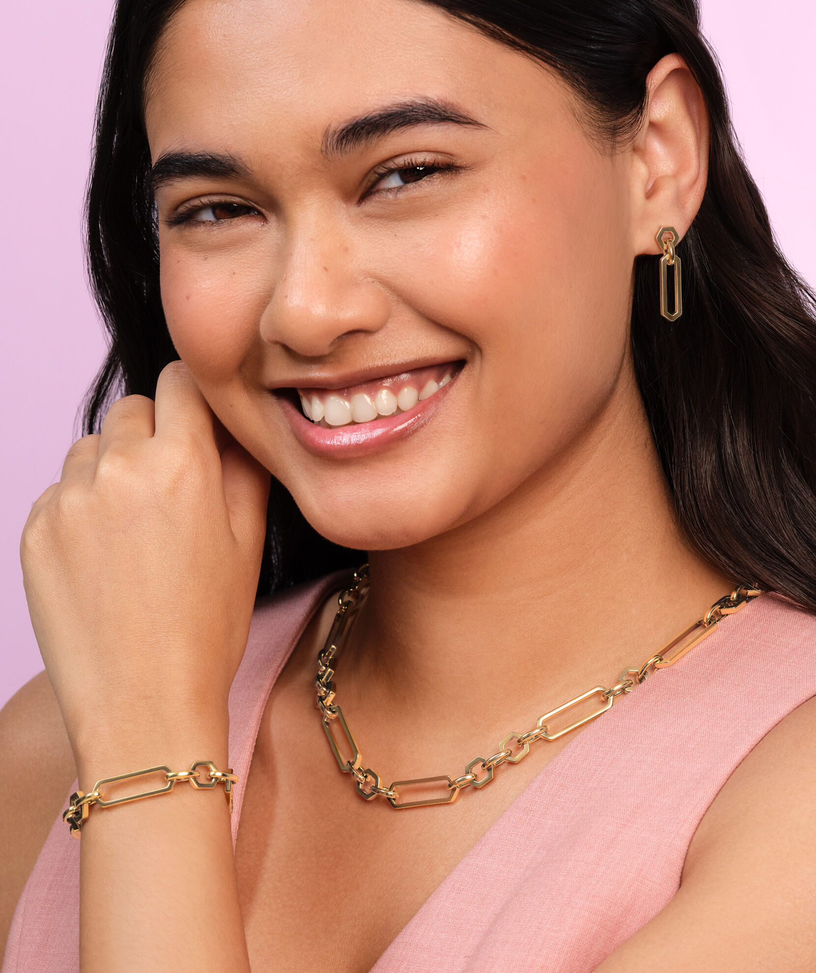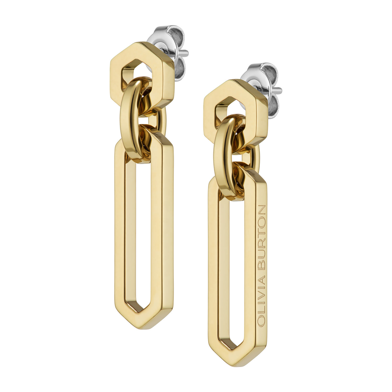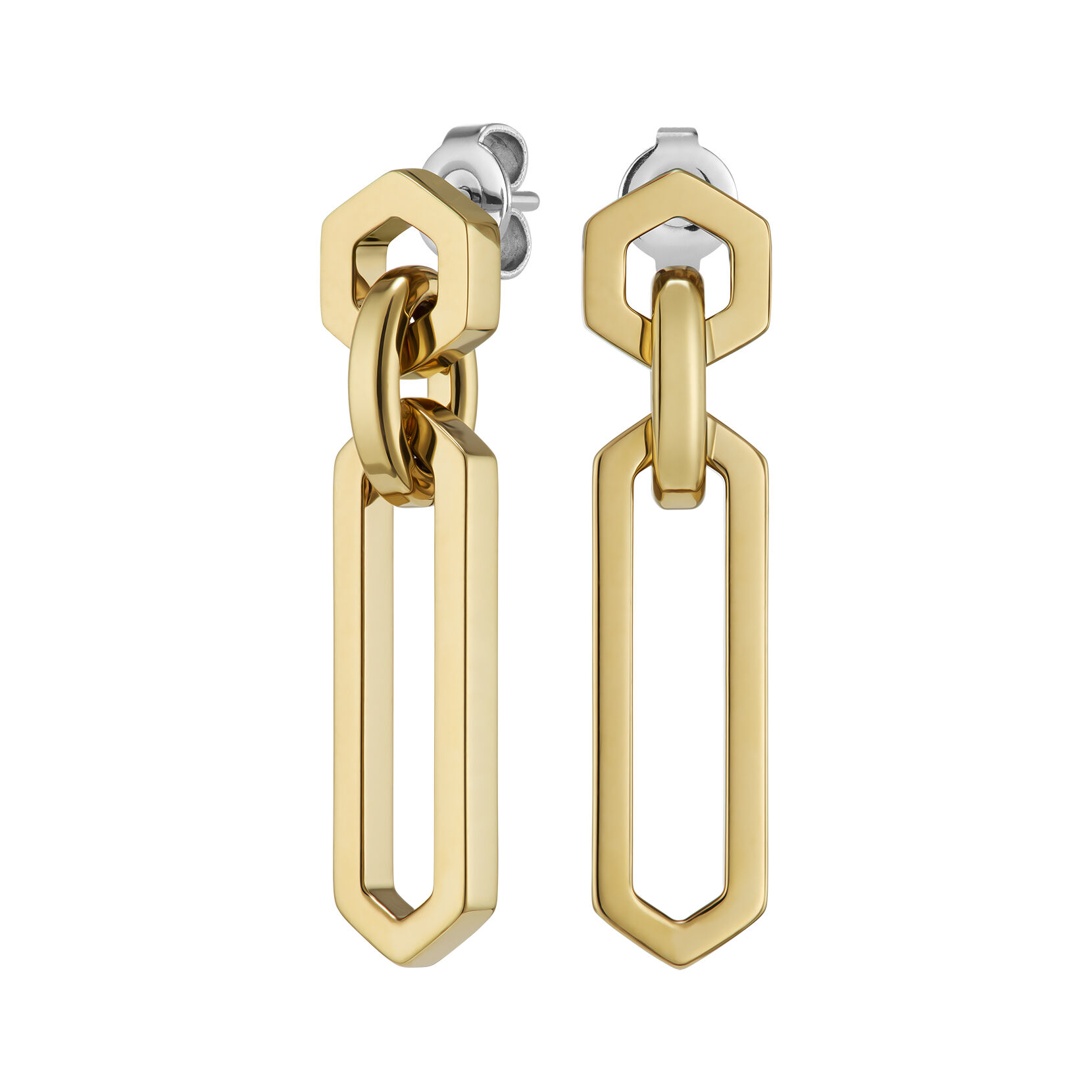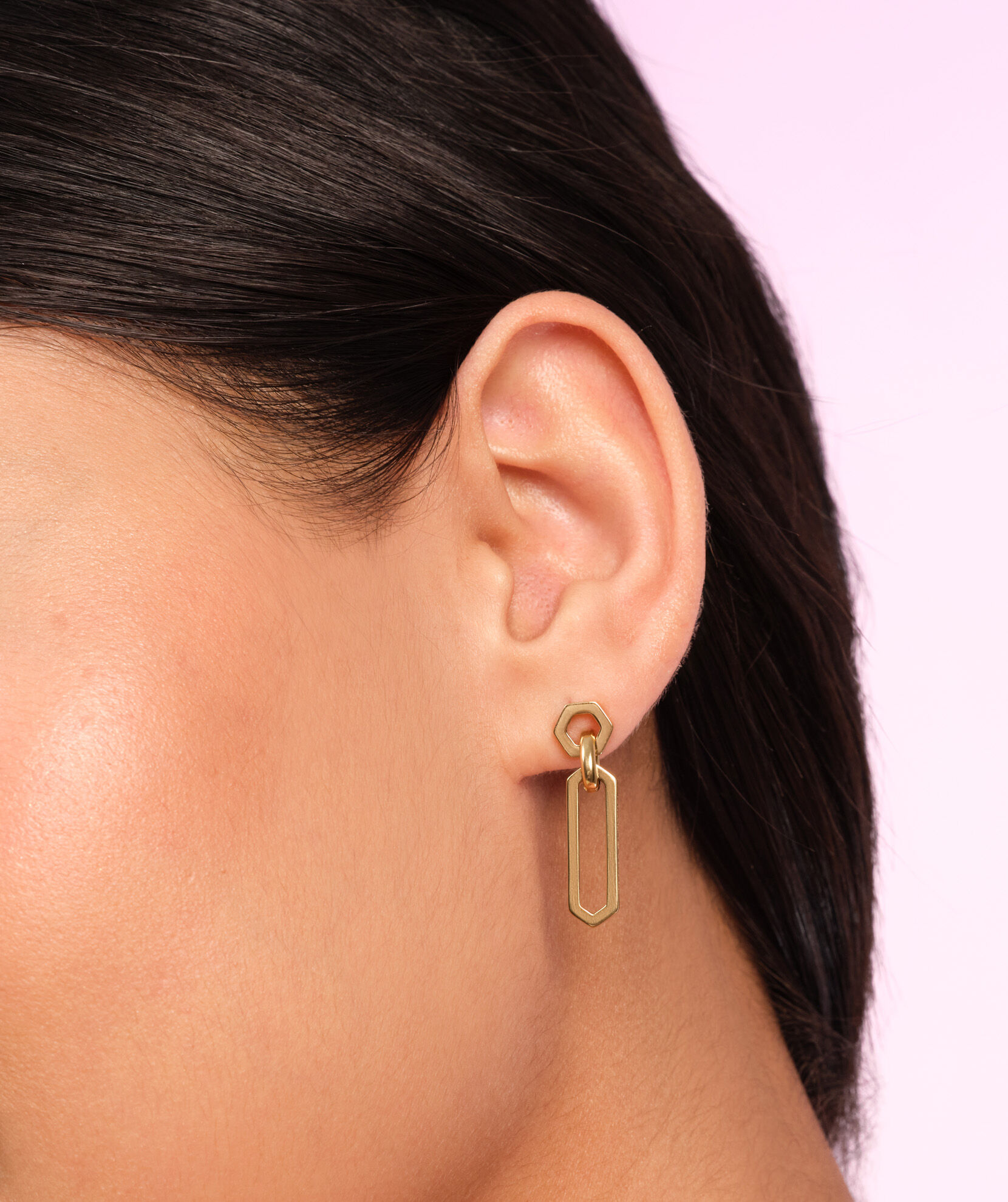 These statement drop earrings are a stylish staple. Comprised of hexagonal stud and interlocking links inspired by the honeycomb, these gold-plated earrings are the perfect way to tap into the statement jewelry trend.