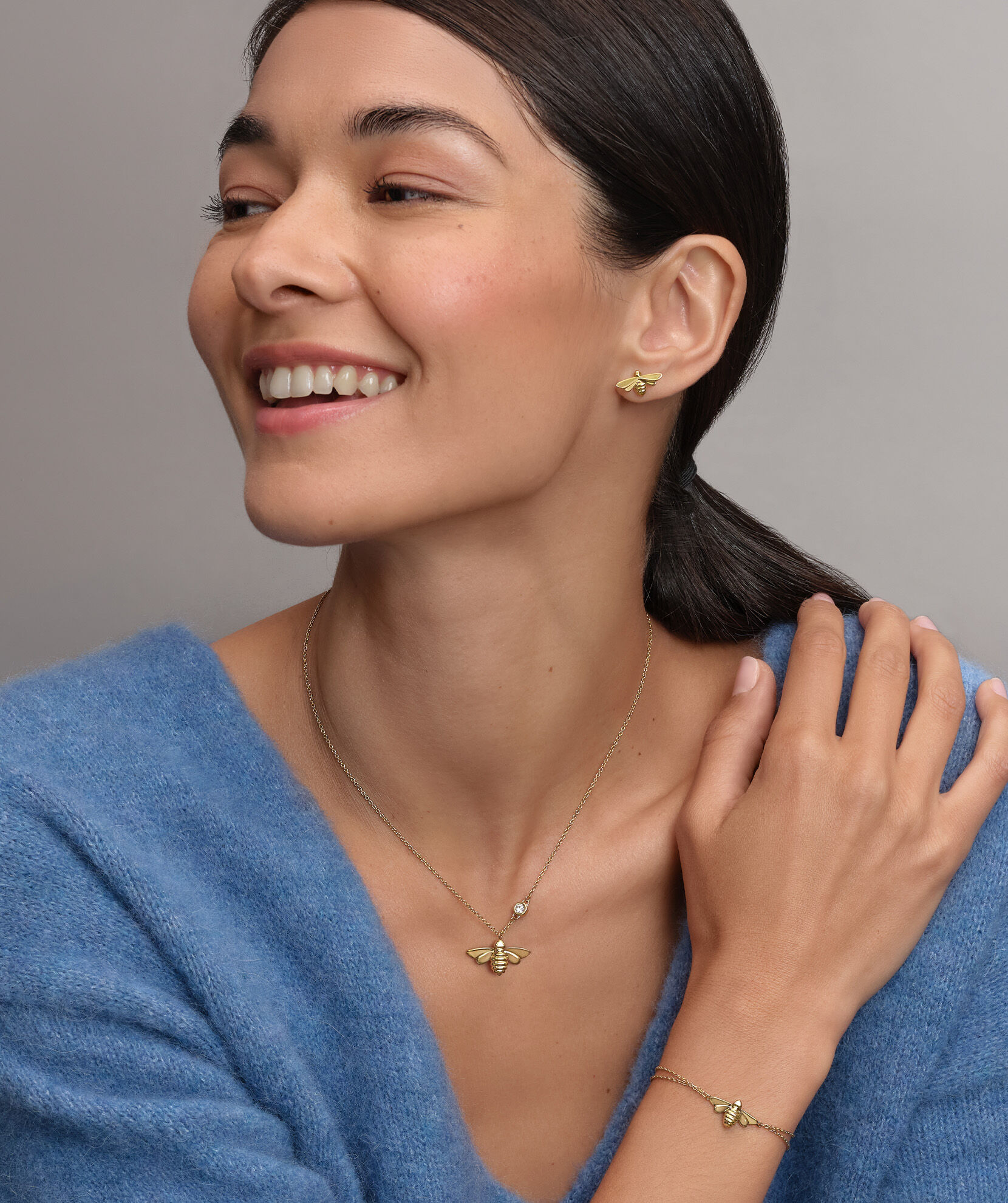 Our best-selling lucky bee gets a contemporary update. This pendant necklace in a radiant gold finish features a charming 3D bee with etched detailing and smooth curves. Teamed with a delicate chain with honeycomb crystal for extra dazzle, this is one piece you won’t want to take off.