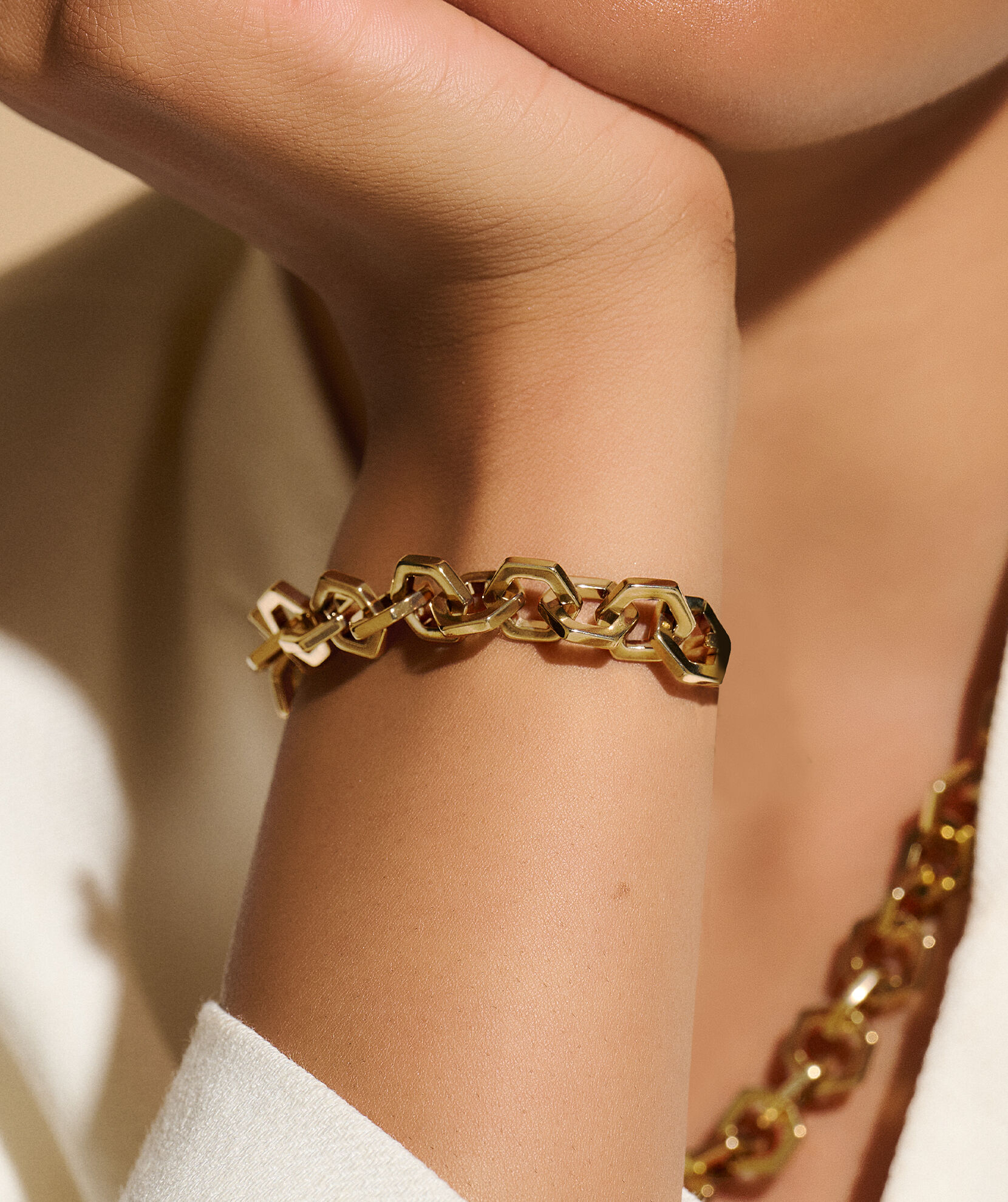 A sophisticated celebration of Olivia Burton’s iconic bee, the Signature jewelry collection is celebrating honeycomb in all its glory. Elegant, bold and contemporary, the Honeycomb Link Bracelet plays on the geometry of the beehive with gold-plated hexagonal links. Complete the set with the Honeycomb Link Necklace for a look that’s Olivia Burton through and through.