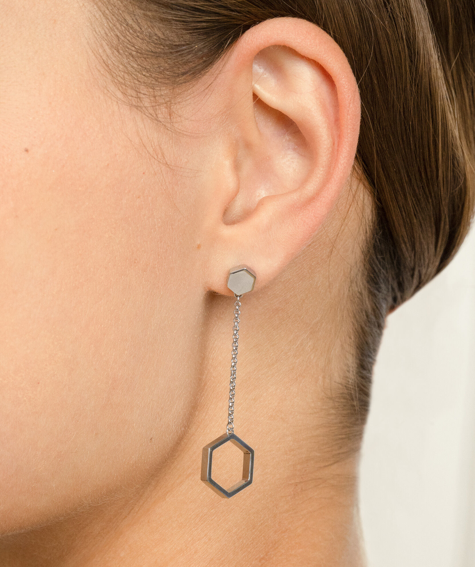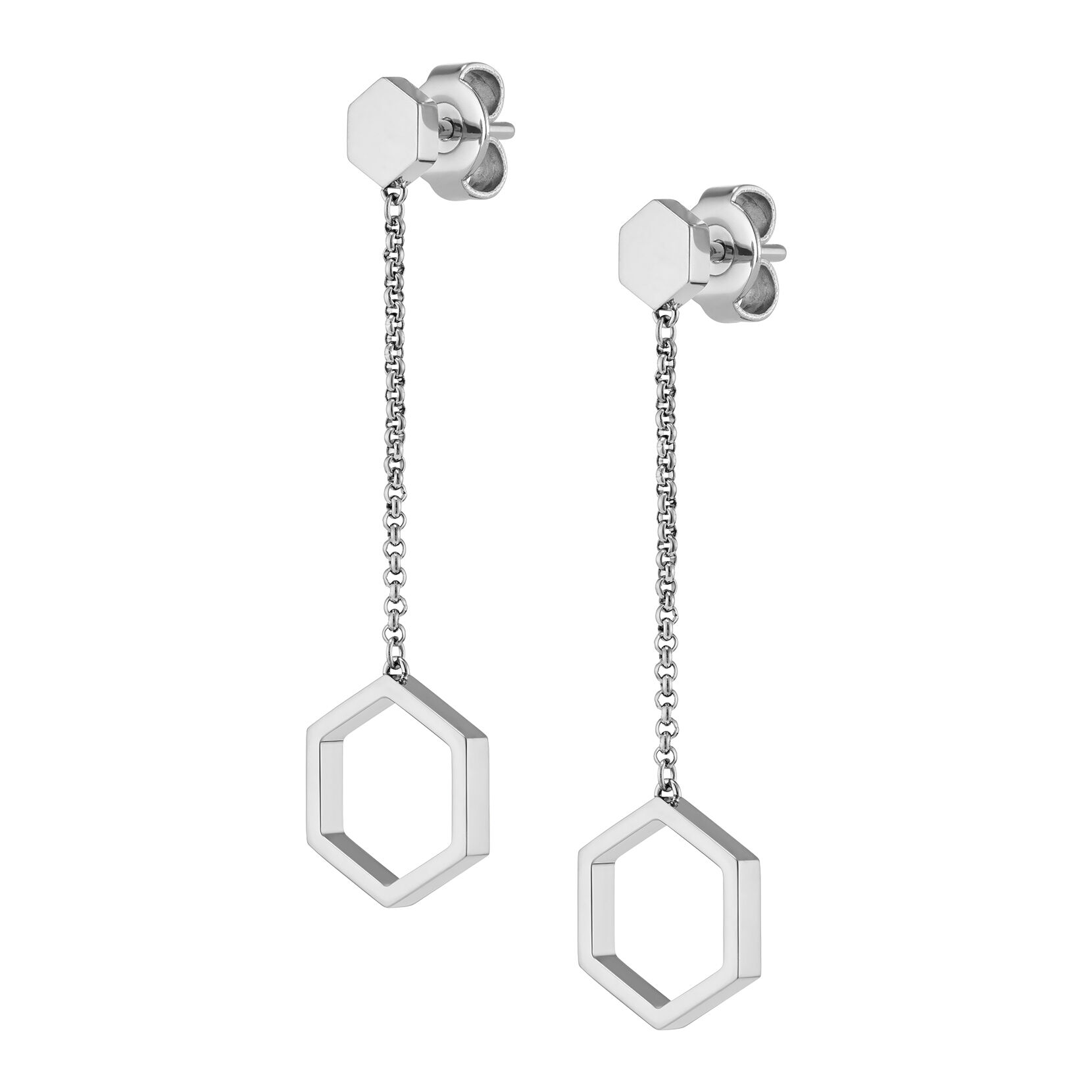 This striking addition to our honeycomb-inspired jewelry collection is sure to be worn on repeat. These silver-tone drop earrings feature featuring a open hexagon suspended from a delicate hexagonal stud by a dainty chain. At last, a statement earring that feels fresh and light.