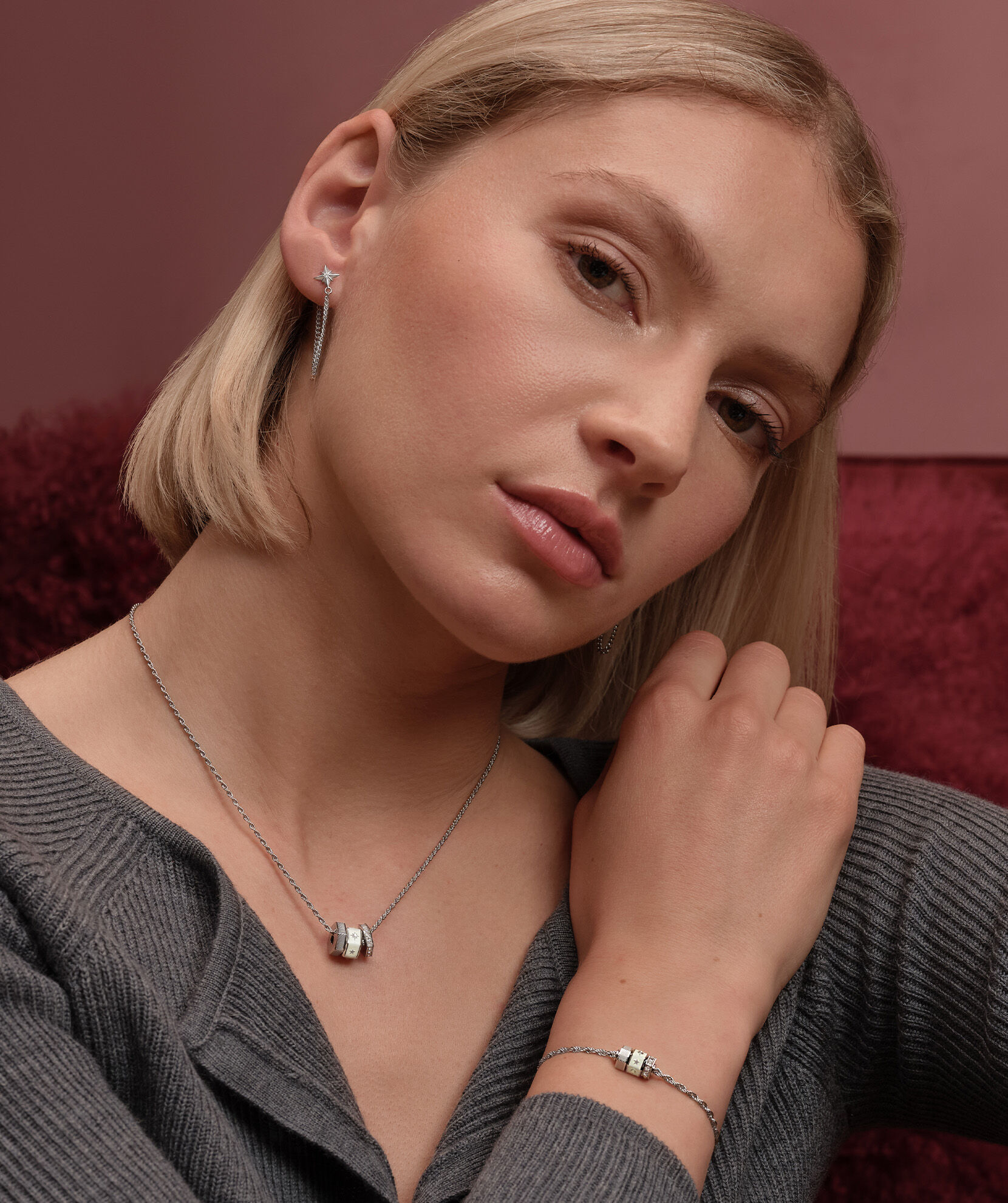 Let your jewelry tell a story with our Bead Charm Necklace. This meaningful piece features a trio of hexagonal beads including the North Star for wisdom and guidance. Each delicate bead charm is full of detail including Ivory enamel, micro pavé crystals and radiant sunburst etching. There’s a hidden surprise from the side with a heart motif cut through each bead. A vintage-inspired silver-tone ‘twist’ chain is a sophisticated finishing touch.
