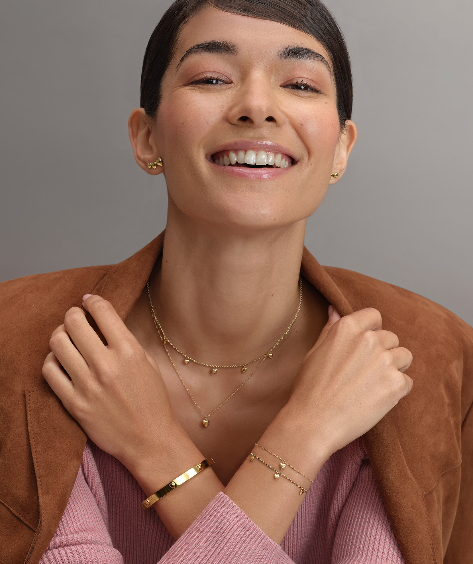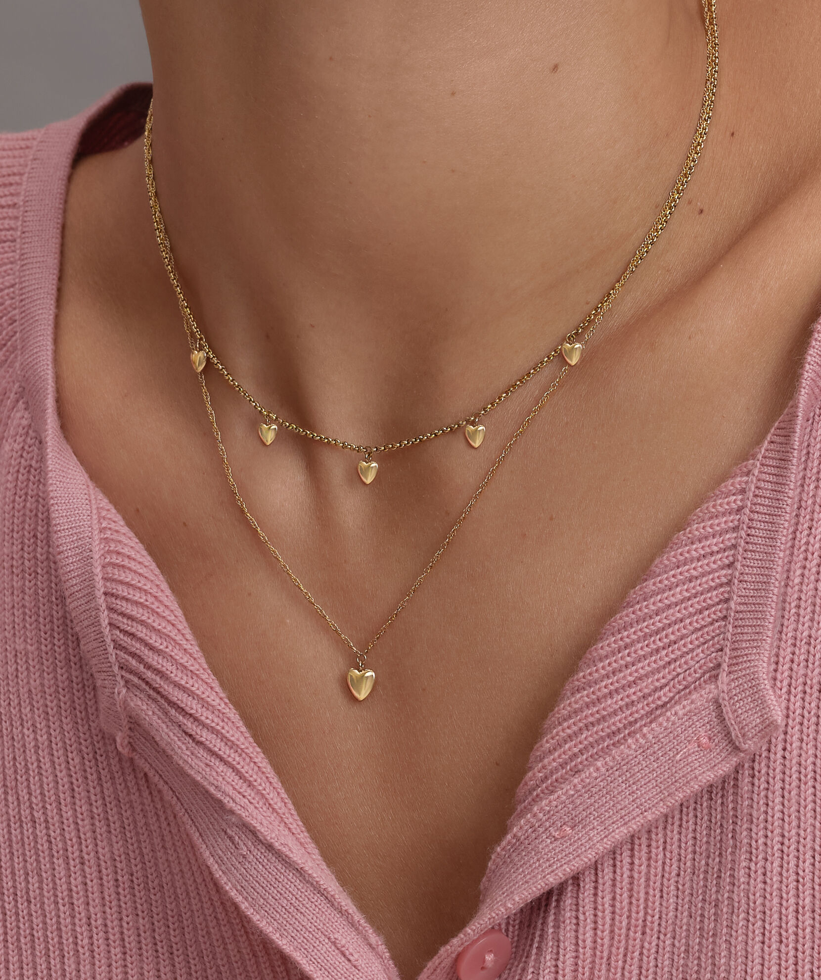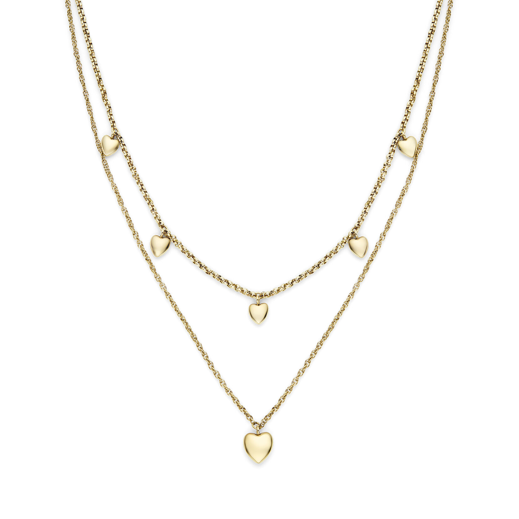 Prepare to fall for our Mini Hearts Collection. This double-layered necklace features stunning 3D hearts. The shorter chain includes five mini hearts whilst the longer vintage-inspired ‘twist’ chain holds a heart pendant. We love the classic gold finish and heart hang tag for that extra little surprise. Can’t get enough? Try the matching bracelet.