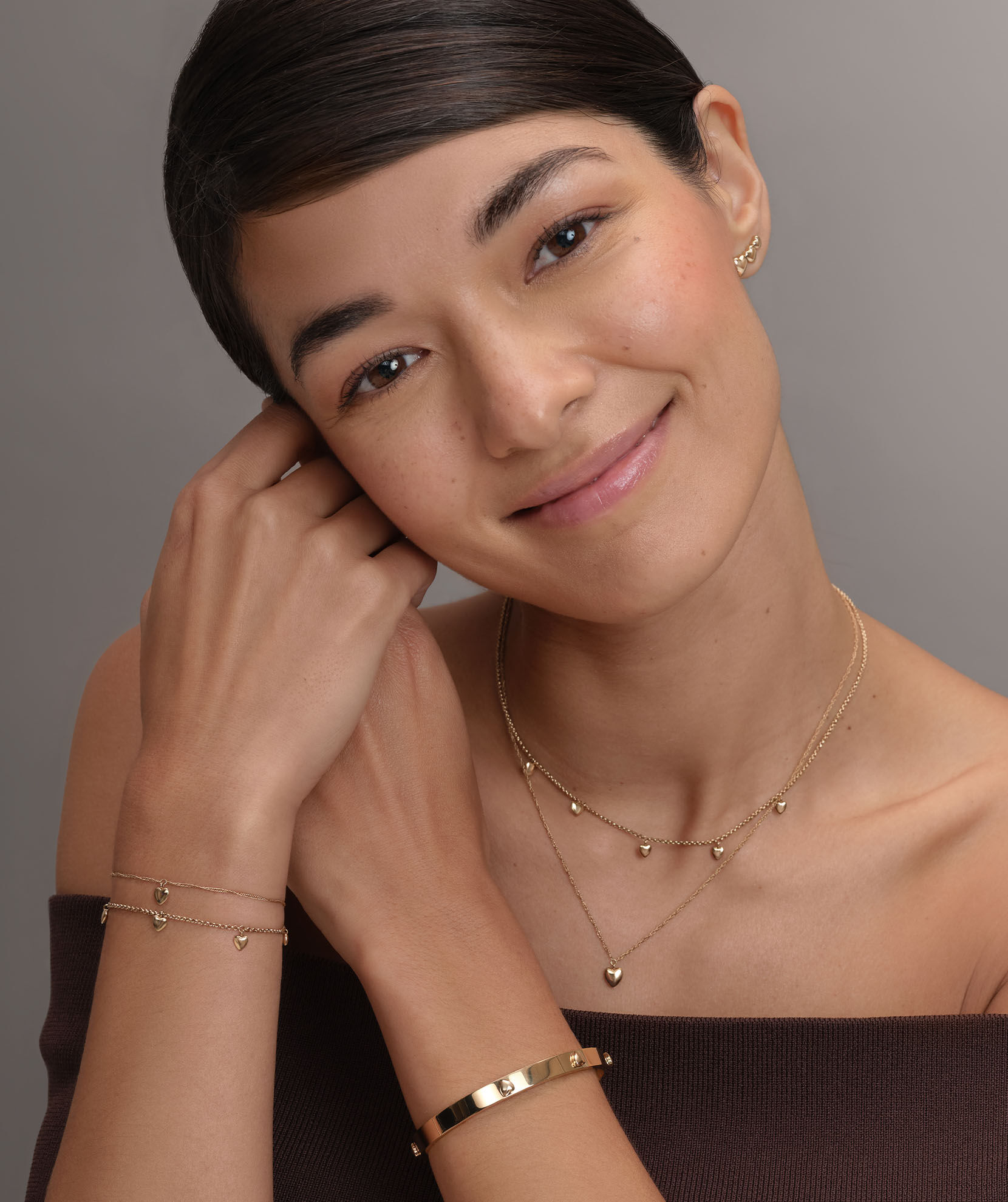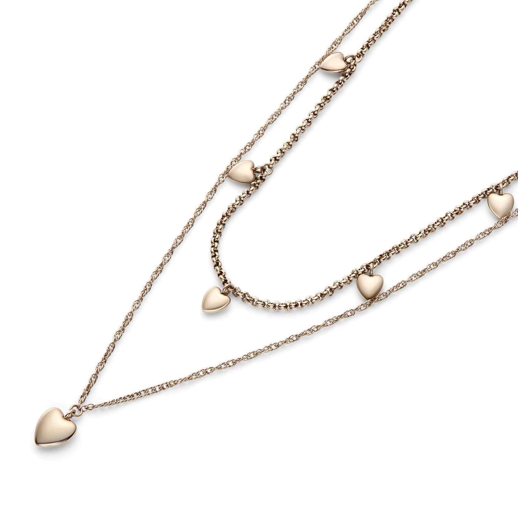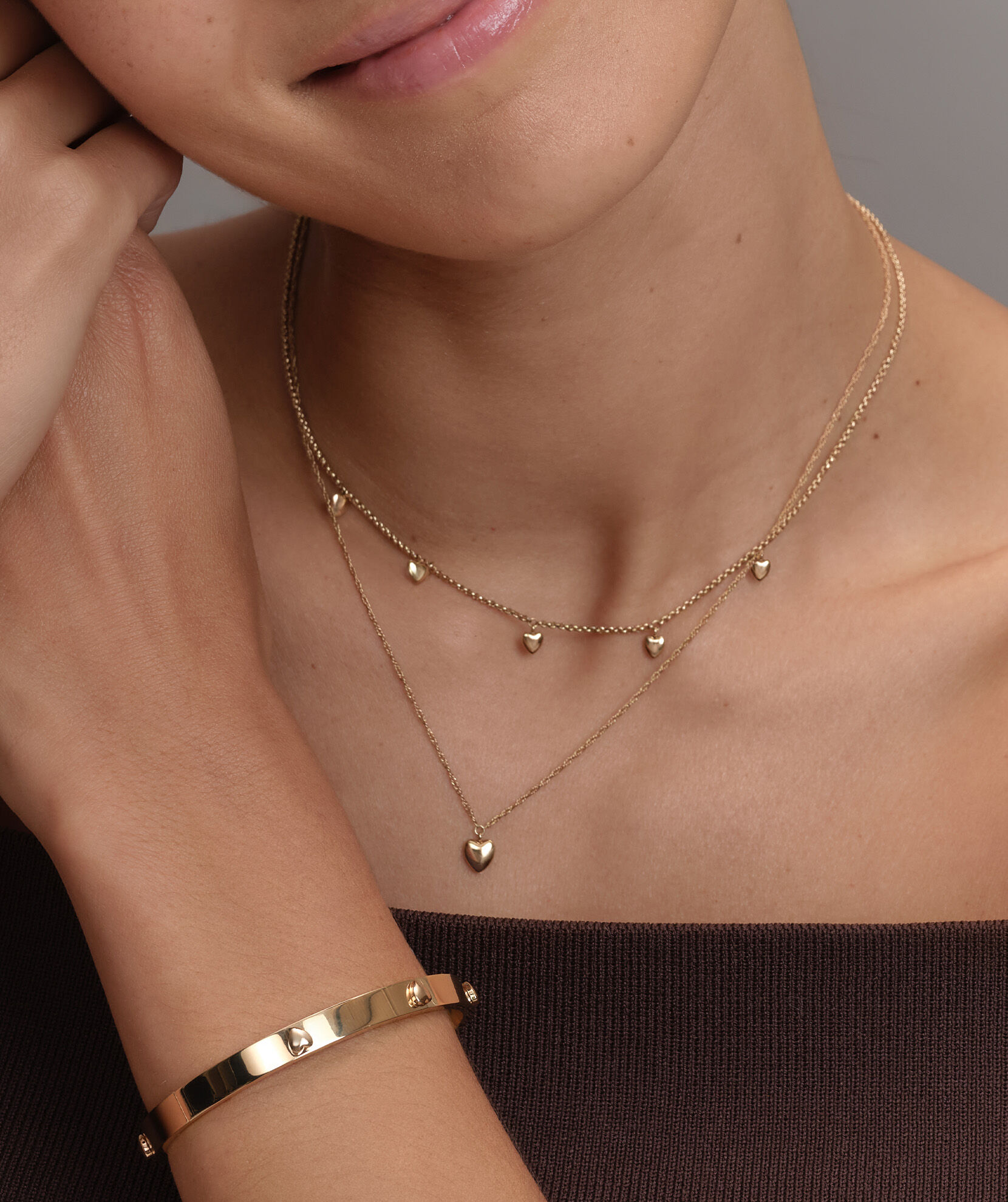 Prepare to fall for our Mini Hearts Collection. This double-layered necklace features stunning 3D hearts. The shorter chain includes five mini hearts whilst the longer vintage-inspired ‘twist’ chain holds a heart pendant. We love the pretty rose gold finish and heart hang tag for that extra little surprise. Can’t get enough? Try the matching bracelet.