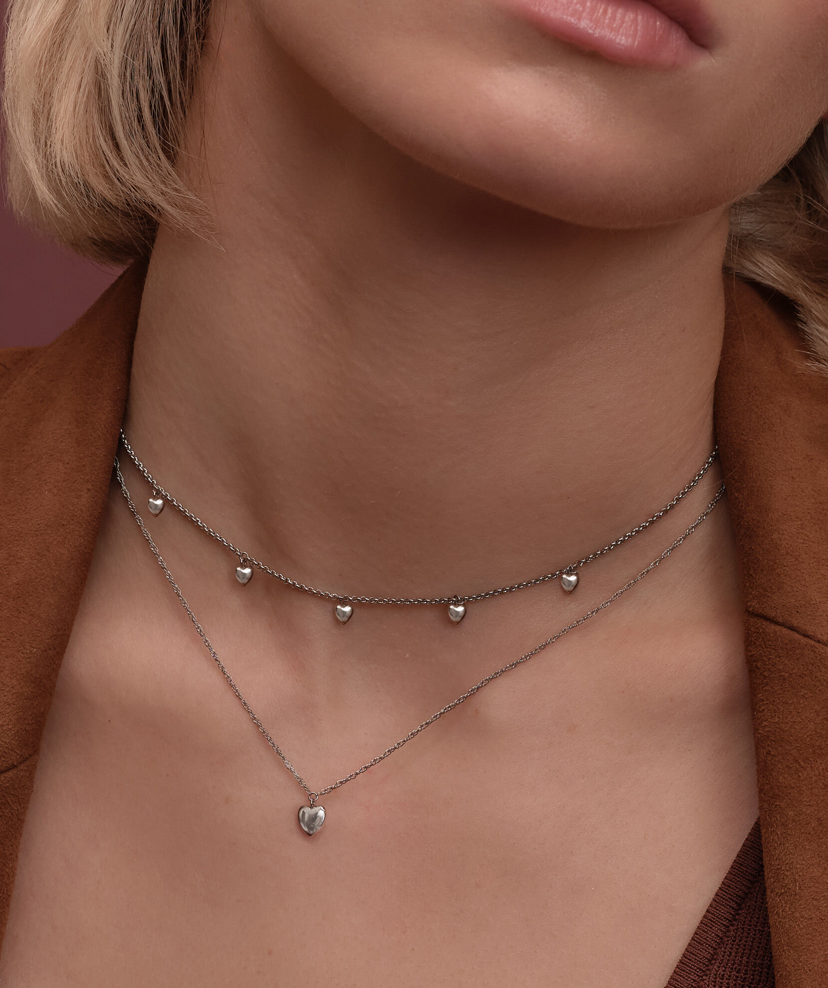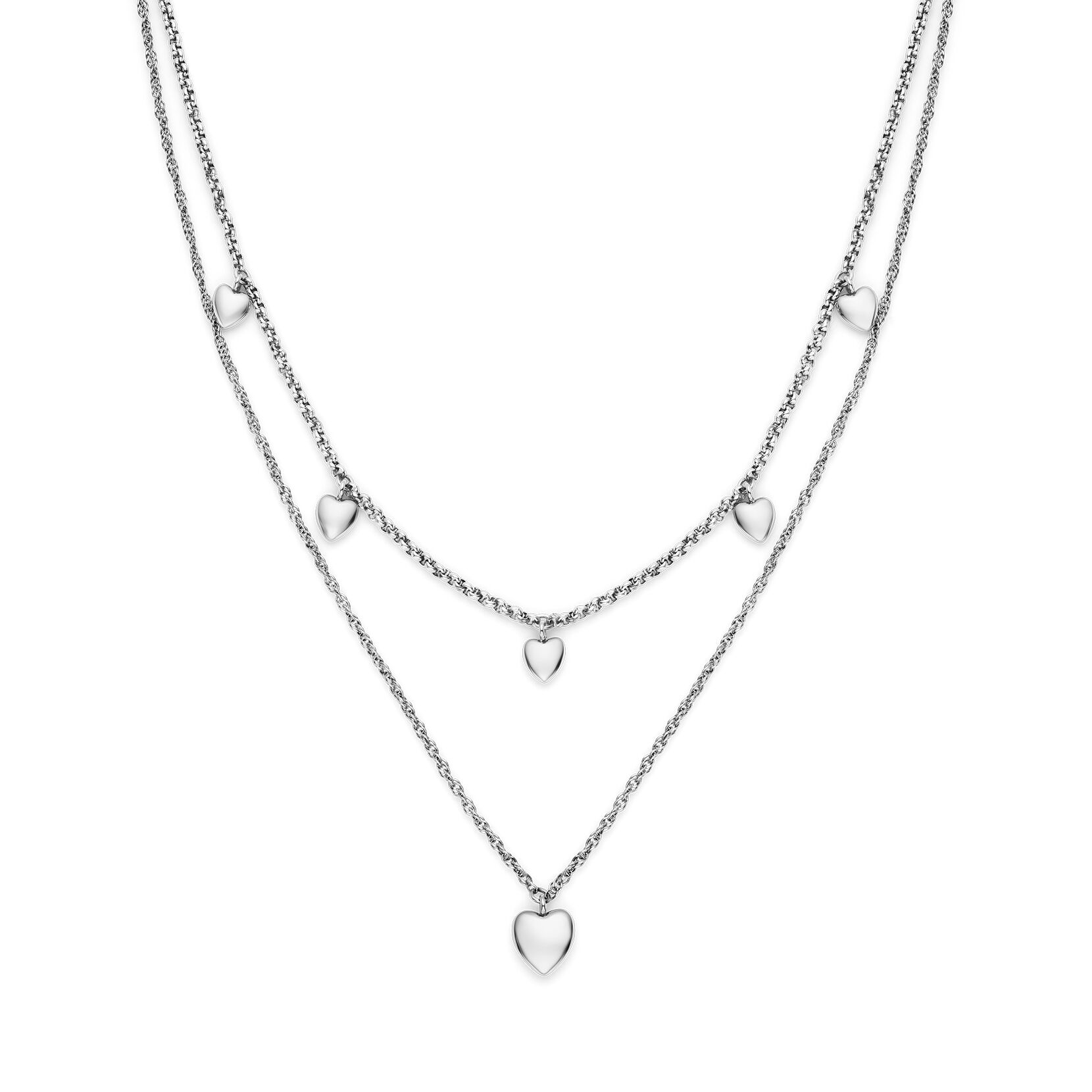 Prepare to fall for our Mini Hearts Collection. This double-layered necklace features stunning 3D hearts. The shorter chain includes five mini hearts whilst the longer vintage-inspired ‘twist’ chain holds a heart pendant. We love the sleek silver finish and heart hang tag for that extra little surprise. Can’t get enough? Try the matching bracelet.