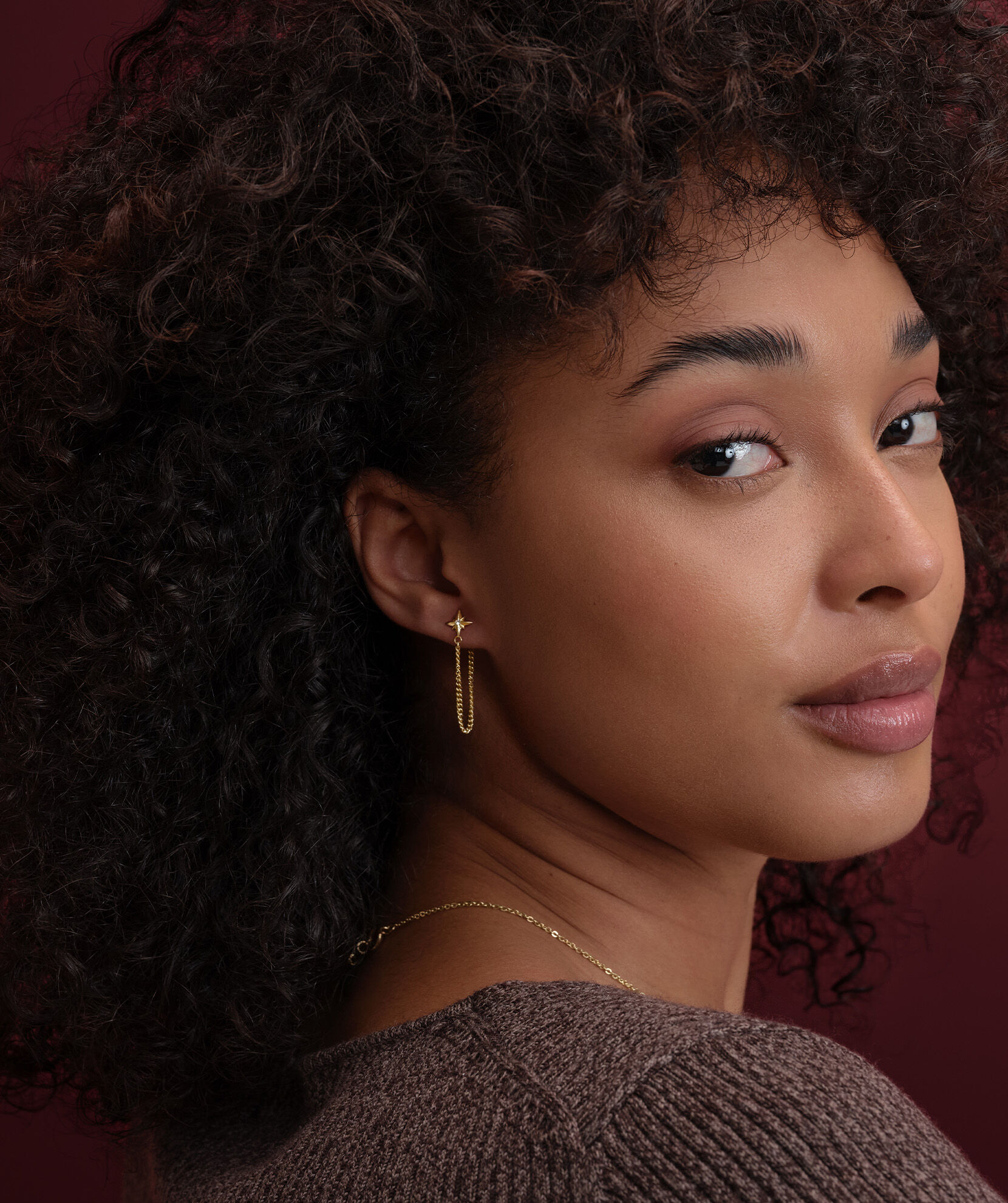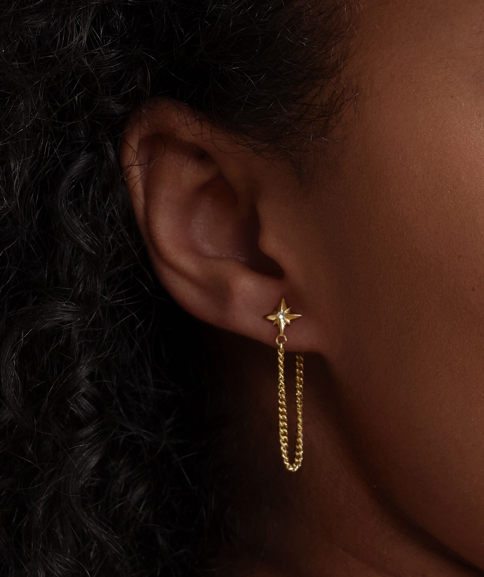 Upgrade your ear stack with these chain earrings. Gold-tone studs feature a crystal-set North Star connected to the butterfly back with an elegant chain. Team with our Soft Square Hoops and Crystal Crawler Studs for an effortless stack.