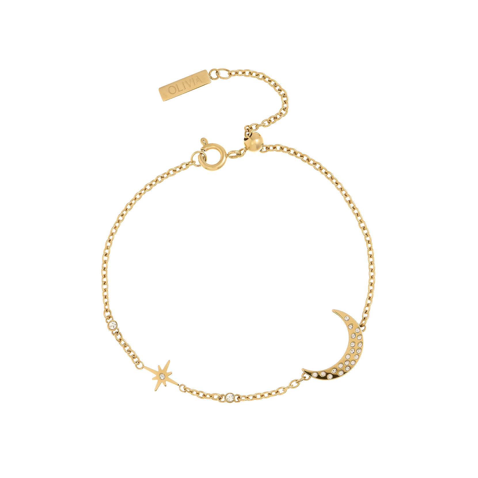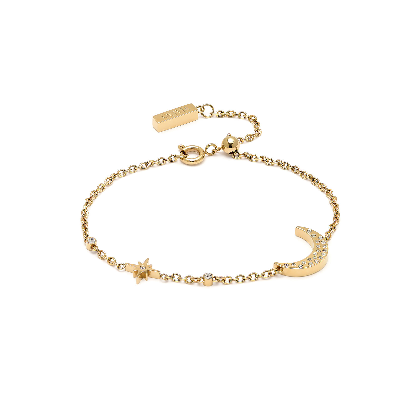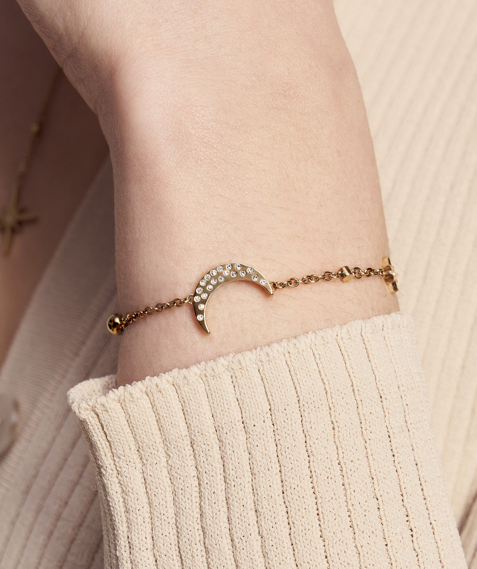 This Celestial North Star & Moon Bracelet is inspired by the moon’s role as a symbol of feminine energy. The delicate chain features a strong crescent moon charm embellished with glowing crystals, then finished with North Star detailing on the chain. This elegant lunar-inspired style should be worn as a talisman, reminding us of our inner power.