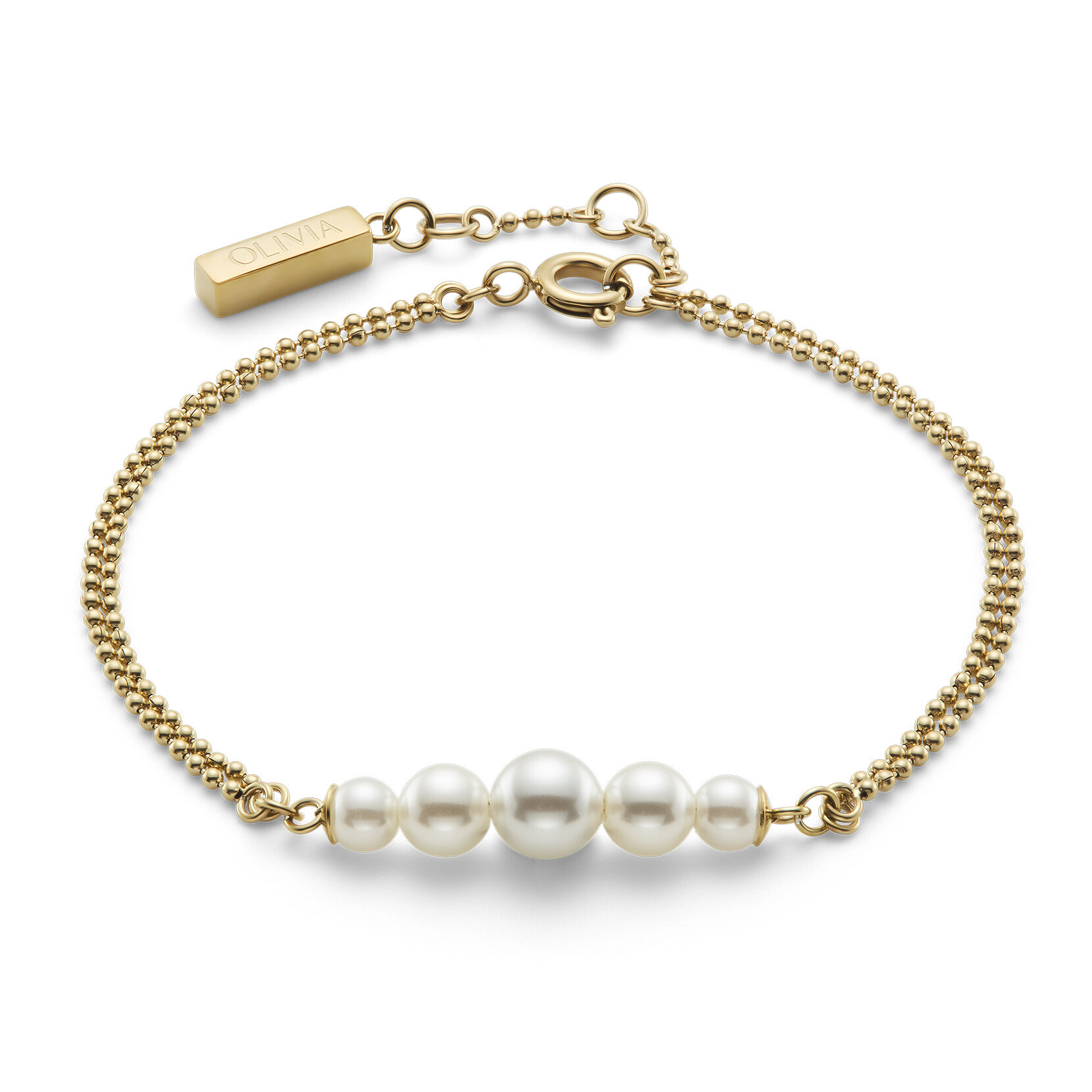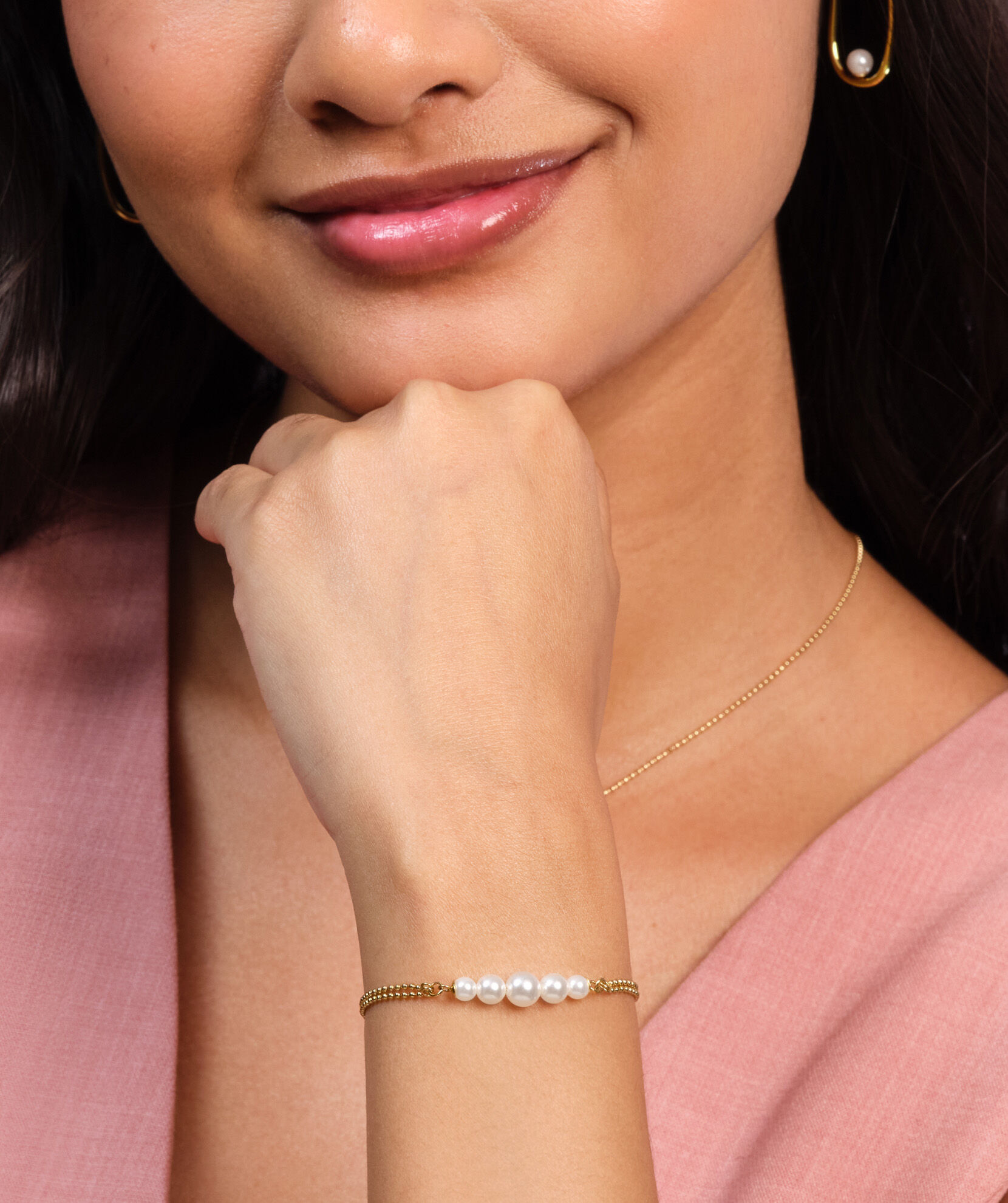 Our playful pearl designs are a modern take on a time-honoured classic. This bracelet features graduated faux pearls on a gold-plated double-strand chain with tiny metal bead details. The double-strand gives an instant stacked look with just one piece.