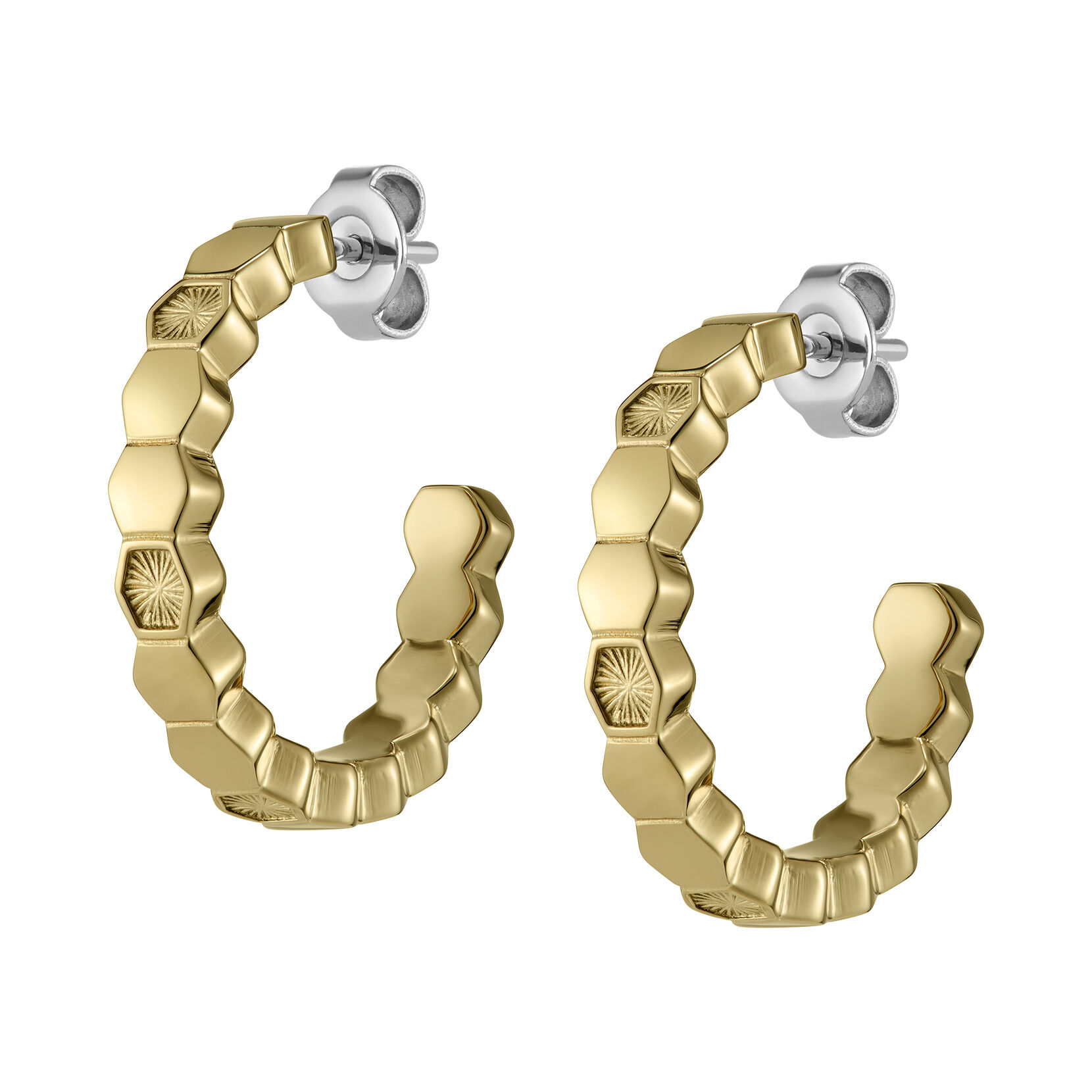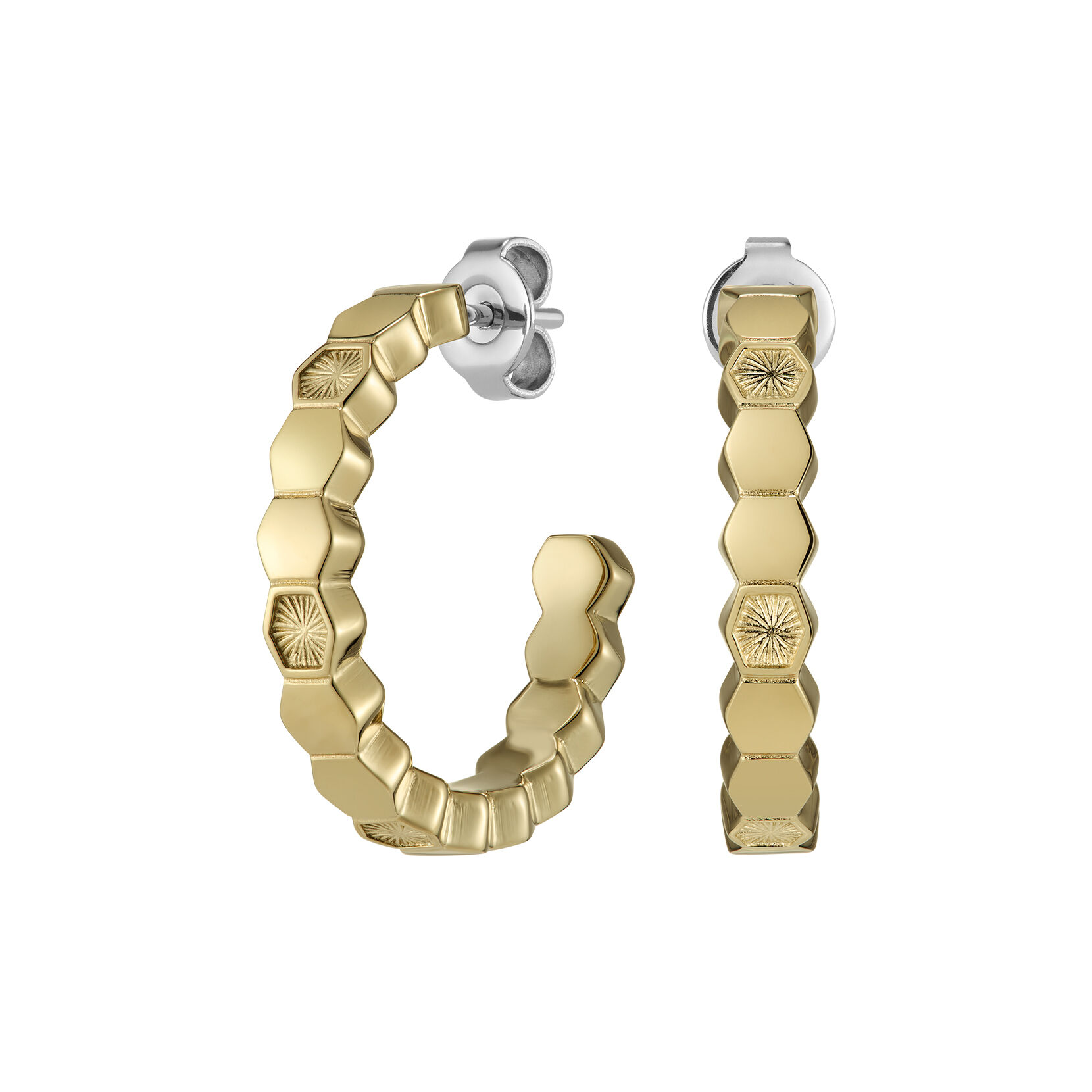 These geometric hoop earrings are a delicate take on the honeycomb. The perfect medium-size for everyday wear with a gold-plated finish, theyâre formed from tiny hexagons for subtle textural detail. The perfect way to add something unexpected to your ear stack.