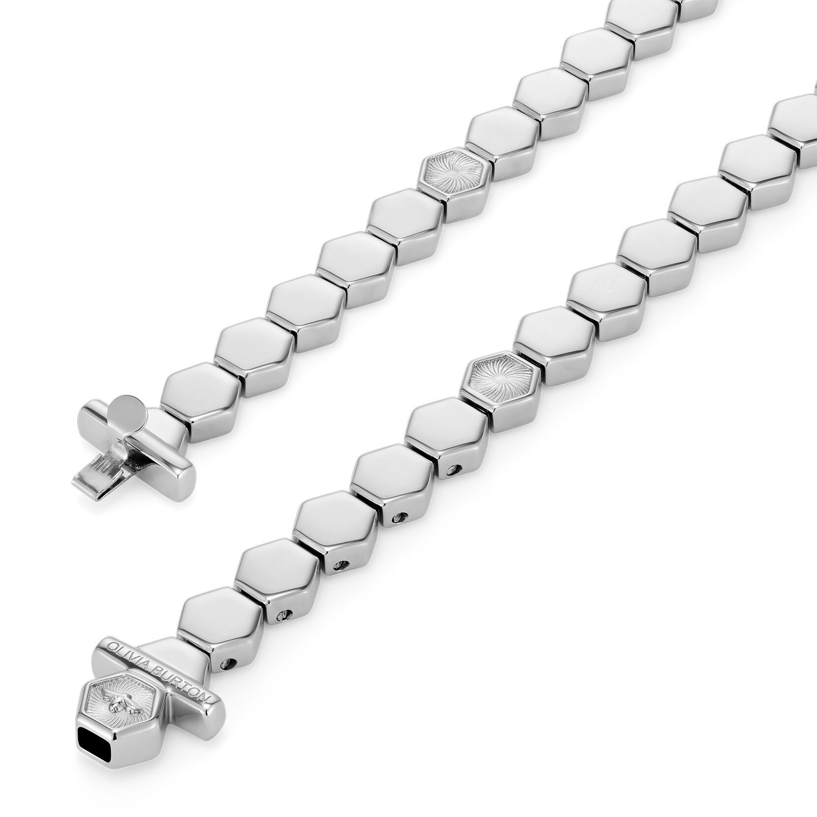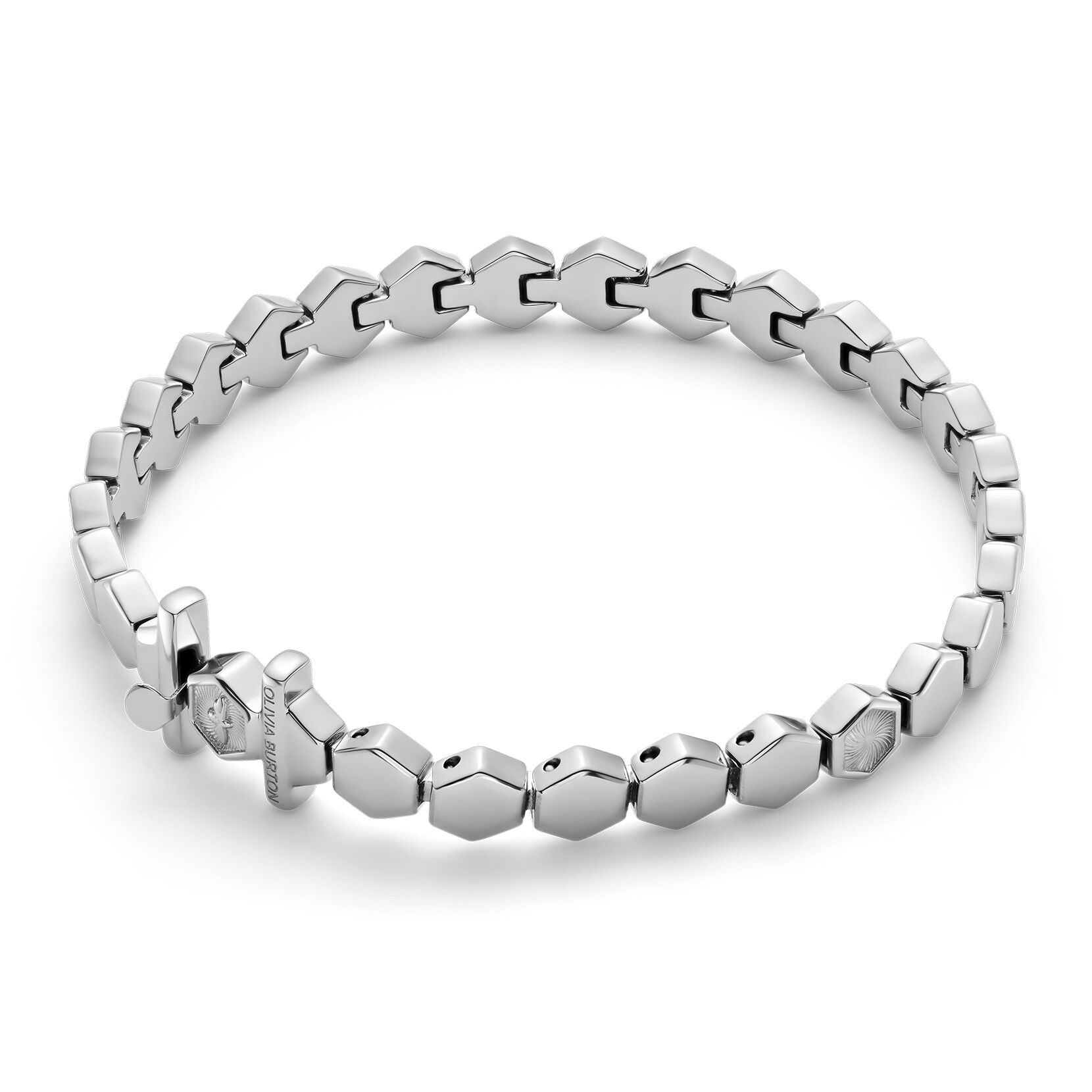 This geometric cuff bracelet is a delicate take on the honeycomb. It features small hexagons with textured swirl finish – a signature pattern you may recognise from our watch dials. This statement silver-tone cuff is the perfect way to add something unexpected to your wrist stack.