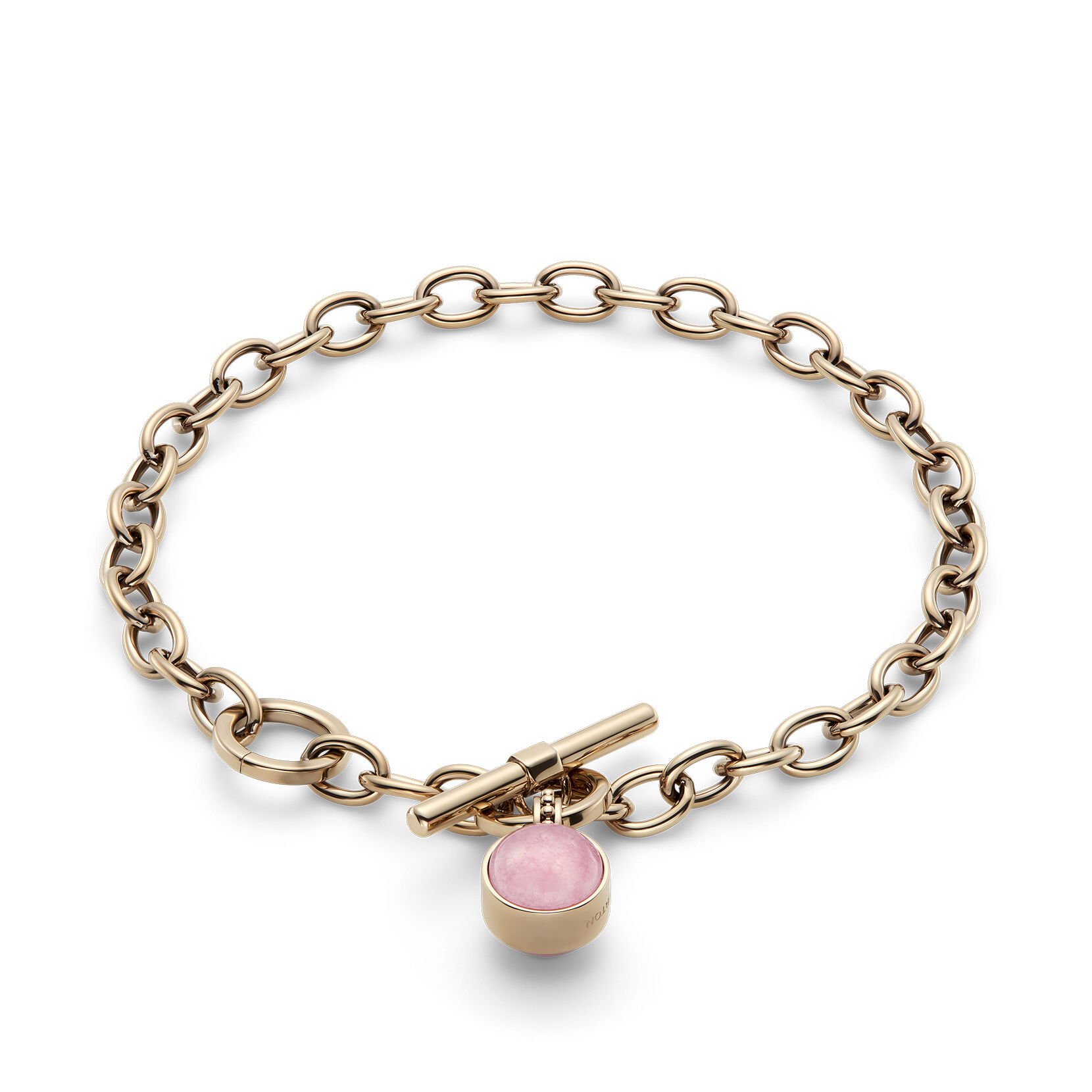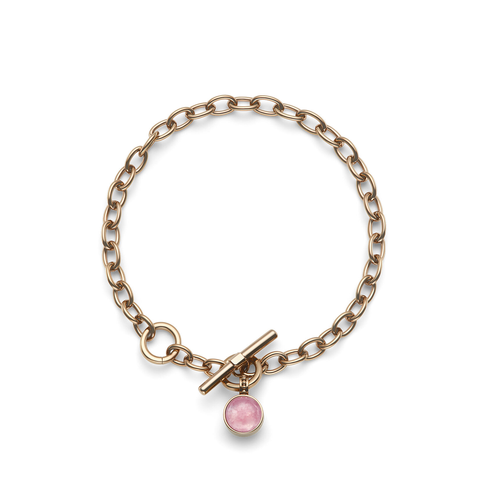 Channel the power and beauty of Quartz with our collection of semi-precious gemstones. This T-bar toggle bracelet features cabochon-set Rose Quartz, believed to bring love and healing, it is paired with a heavy-weight rose gold-plated chain for a simple, elegant look. This meaningful piece makes a gorgeous gift and brings color to any jewelry wardrobe.