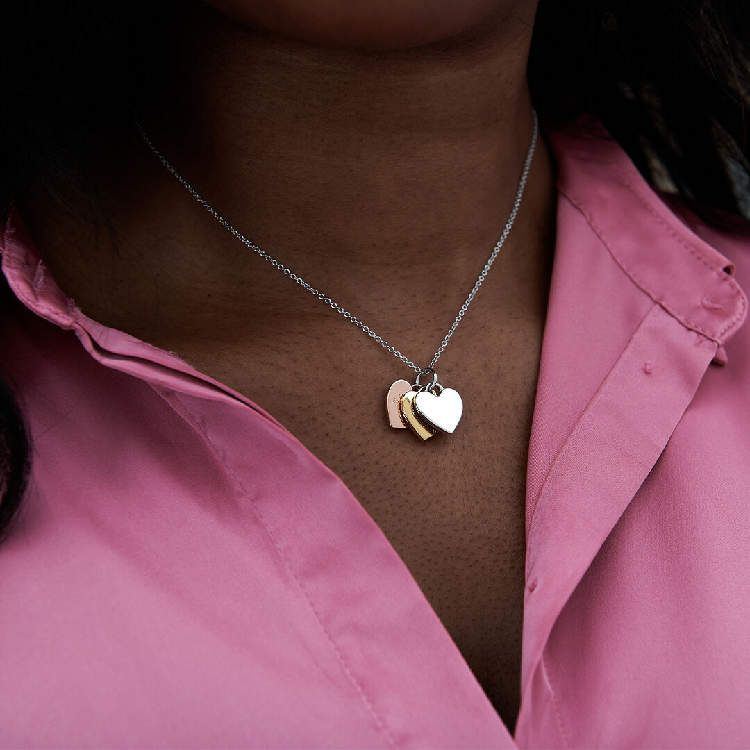 Never underestimate the power of mixing metals. Our Classic Heart 3 Tone Necklace is all the proof you need. Three polished heart charms (in rose gold, gold and silver tones) suspend from a delicate silver chain. Gleaming and layered, this piece pairs up perfectly with our Classic Heart Huggies.