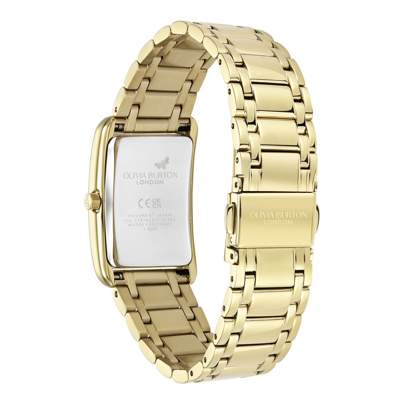 Our rectangular Grove dial is just the style for fans of classic design with a playful twist. The rectangular face is full of sophisticated details with a powdered centre and sunray border in Forest Green. A slim metal case and minimalist markers make for simple everyday elegance. Finished with a gold-plated 5-link bracelet strap, this watch elevates any look, day or night.