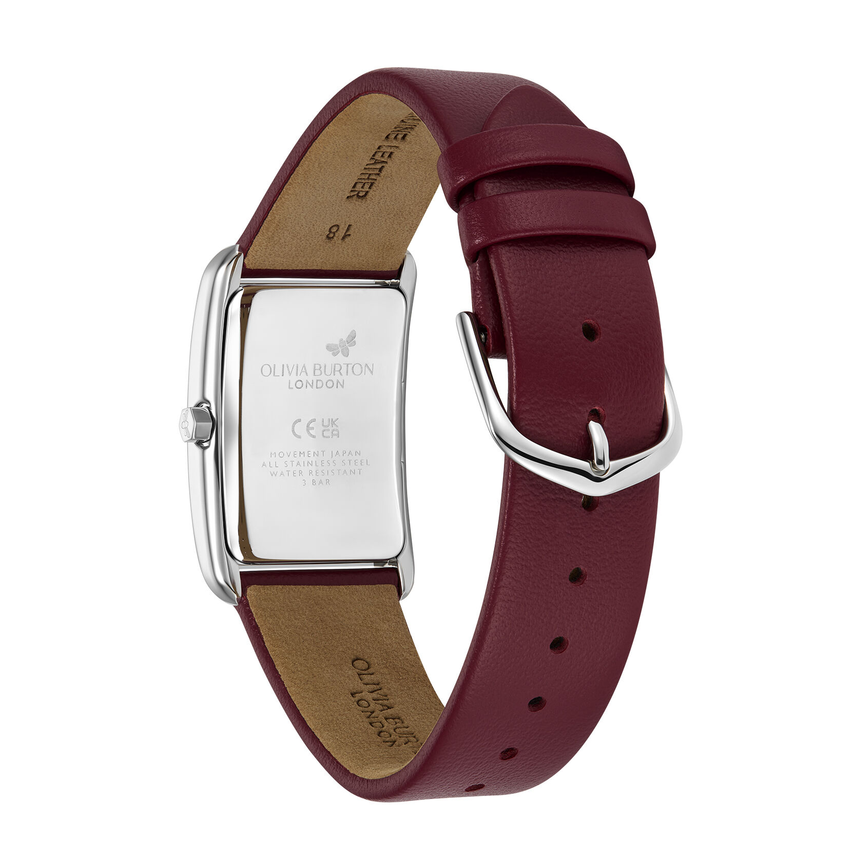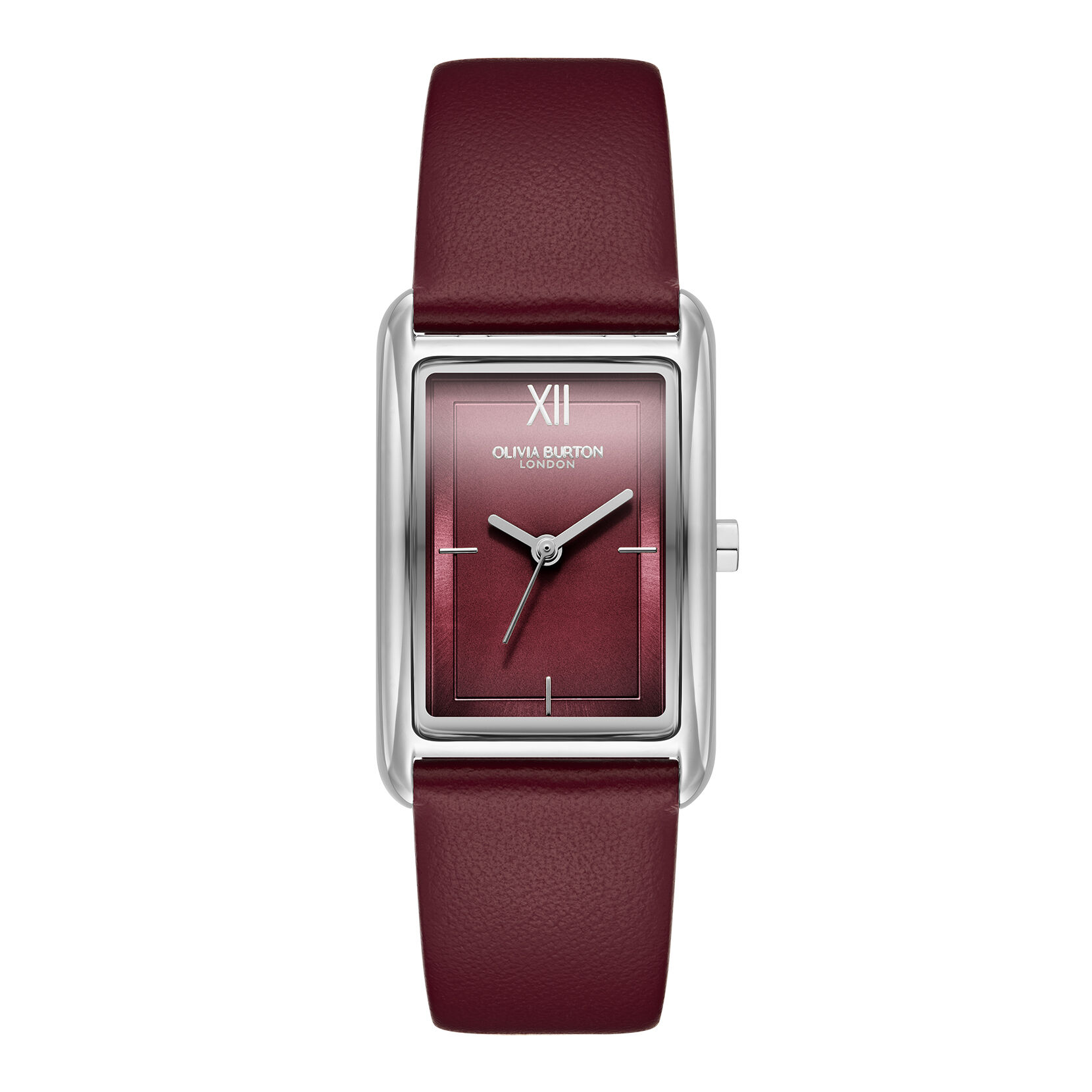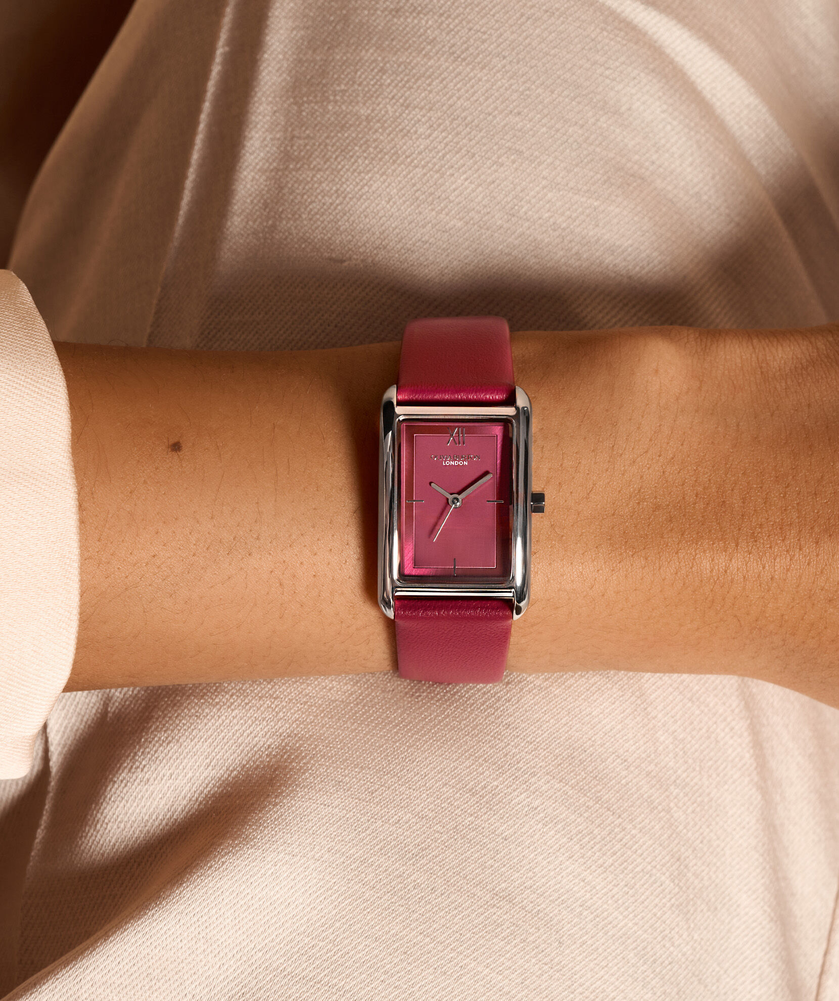 Our rectangular Grove dial is just the style for fans of classic design with a playful twist. The rectangular face is full of sophisticated details with a powdered centre and sunray border in Cranberry. A slim silver-finish case and minimalist markers make for simple everyday elegance. Finished with a soft leather strap in rich Cranberry, this watch elevates any look, day or night.