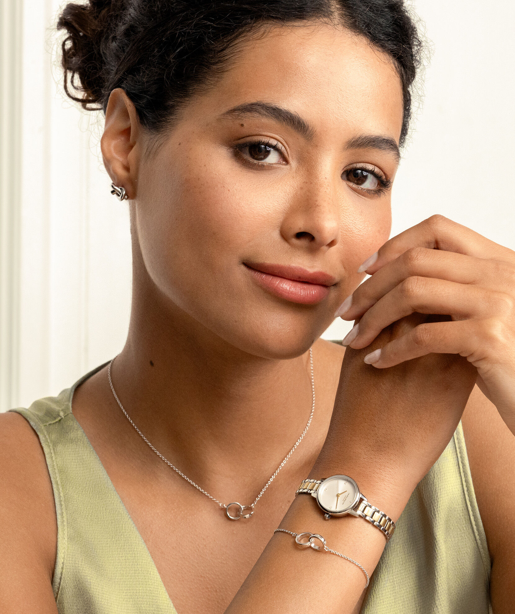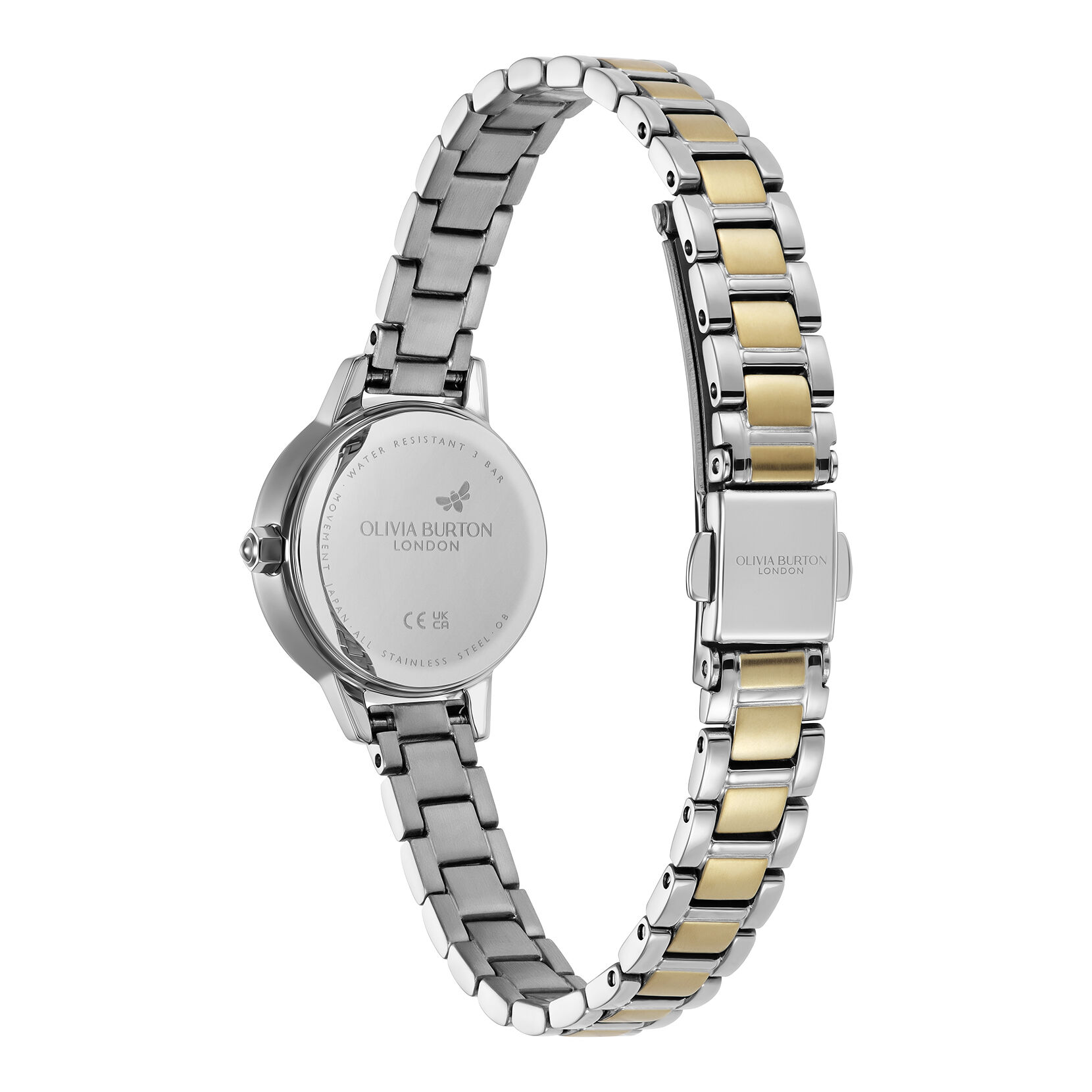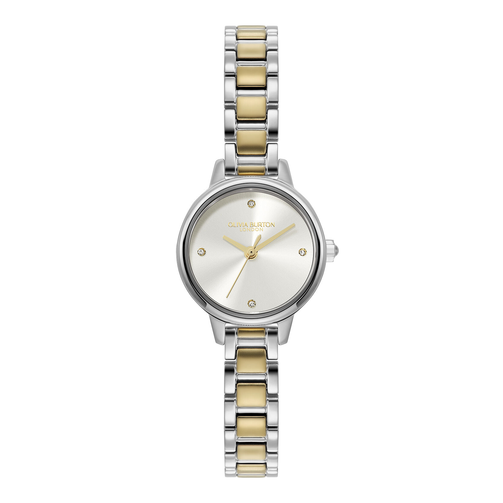 The mini watch is back and more beautiful than ever. Designed to blend modern with classic, this dainty 23mm dial is as pretty as a piece of jewelry. Its glowing sunray dial in elegant Silver White is embellished with tiny crystal markers for a touch of sparkle. Finished with a beautiful two-tone gold-plated and silver-tone bracelet, this petite style is perfect for stacking.