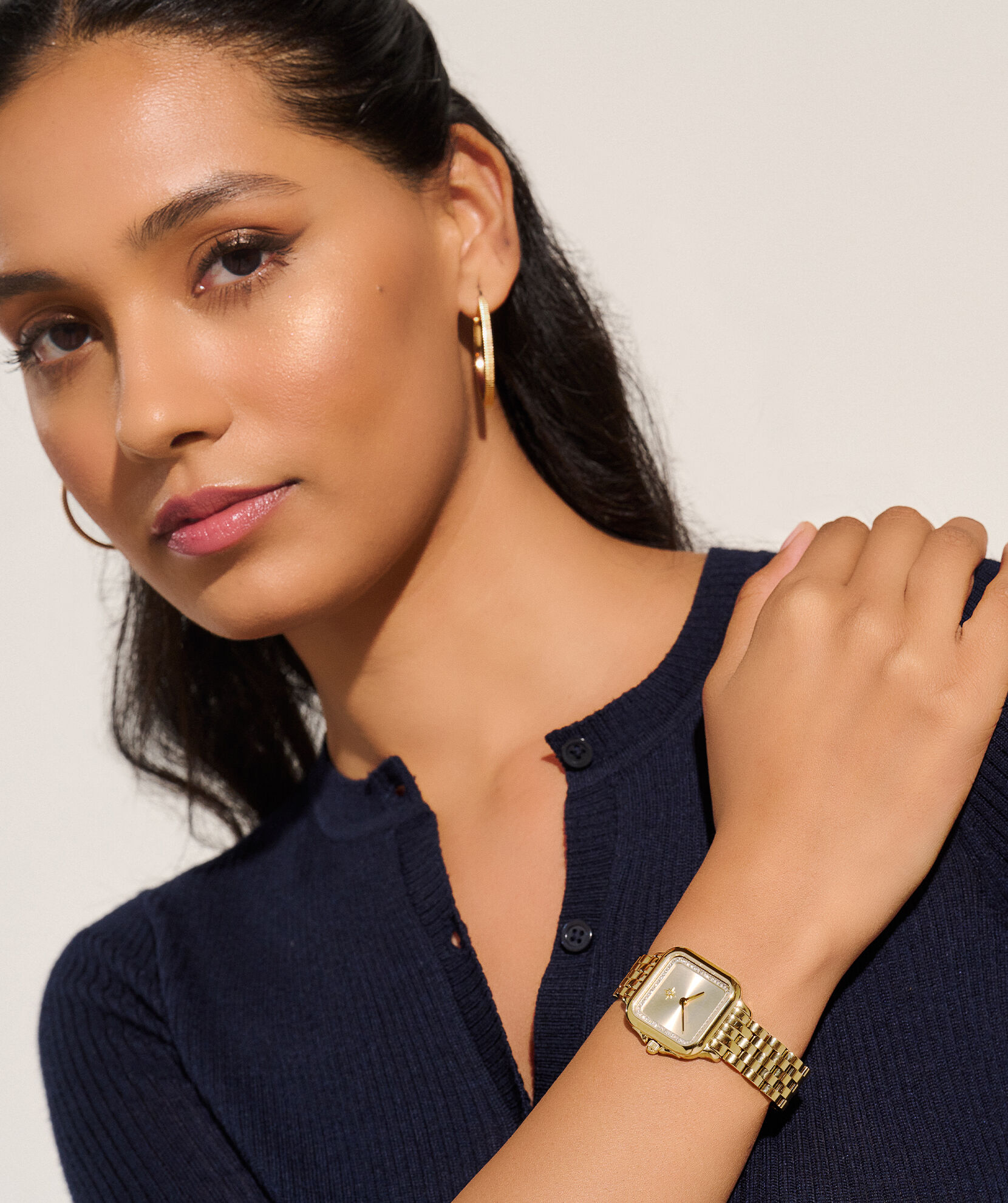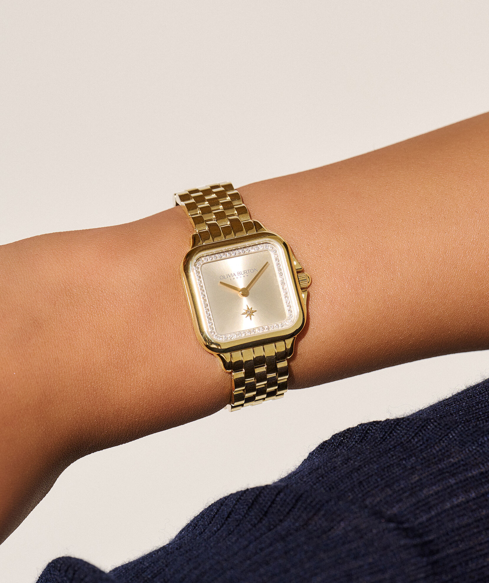 Get lost in London with the Grosvenor watch, inspired by the city’s streets, squares and iconic architecture. The latest addition to our Classics collection, the soft, rounded corners of the case are a feminine twist on a classic, angular shape. A shimmering Light Gold sunray dial with crystal details frames our iconic North Star for that extra guiding light. The gold-plated link bracelet strap and polished bezel give a luxe feel to a new classic. Cutting corners has never looked so good…