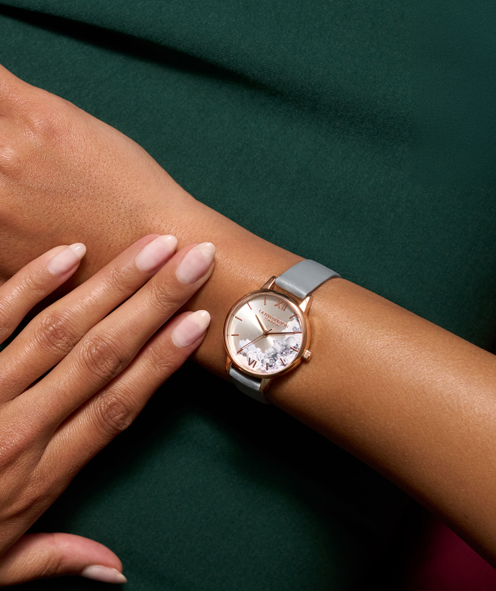 Take a stroll in the English countryside with this classic floral style. The Silver White sunray dial is embellished with delicate hand painted peonies in a gentle palette of inky blues and greys. Paired with a sleek rose gold-plated case and Chalk Blue leather strap, this beauty will be blooming all year round.