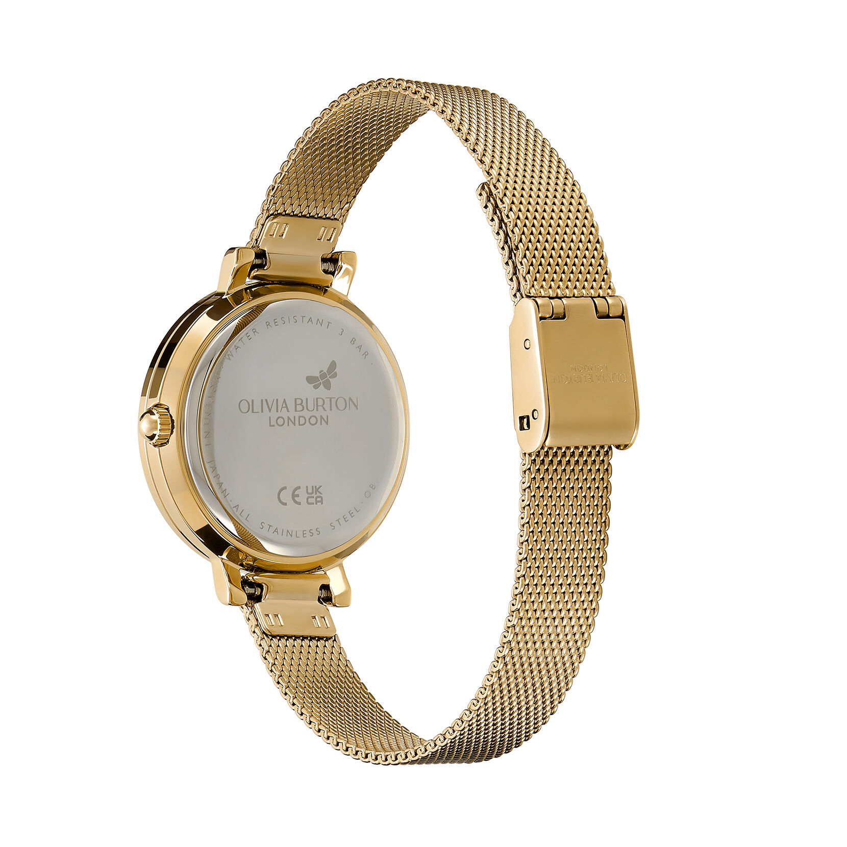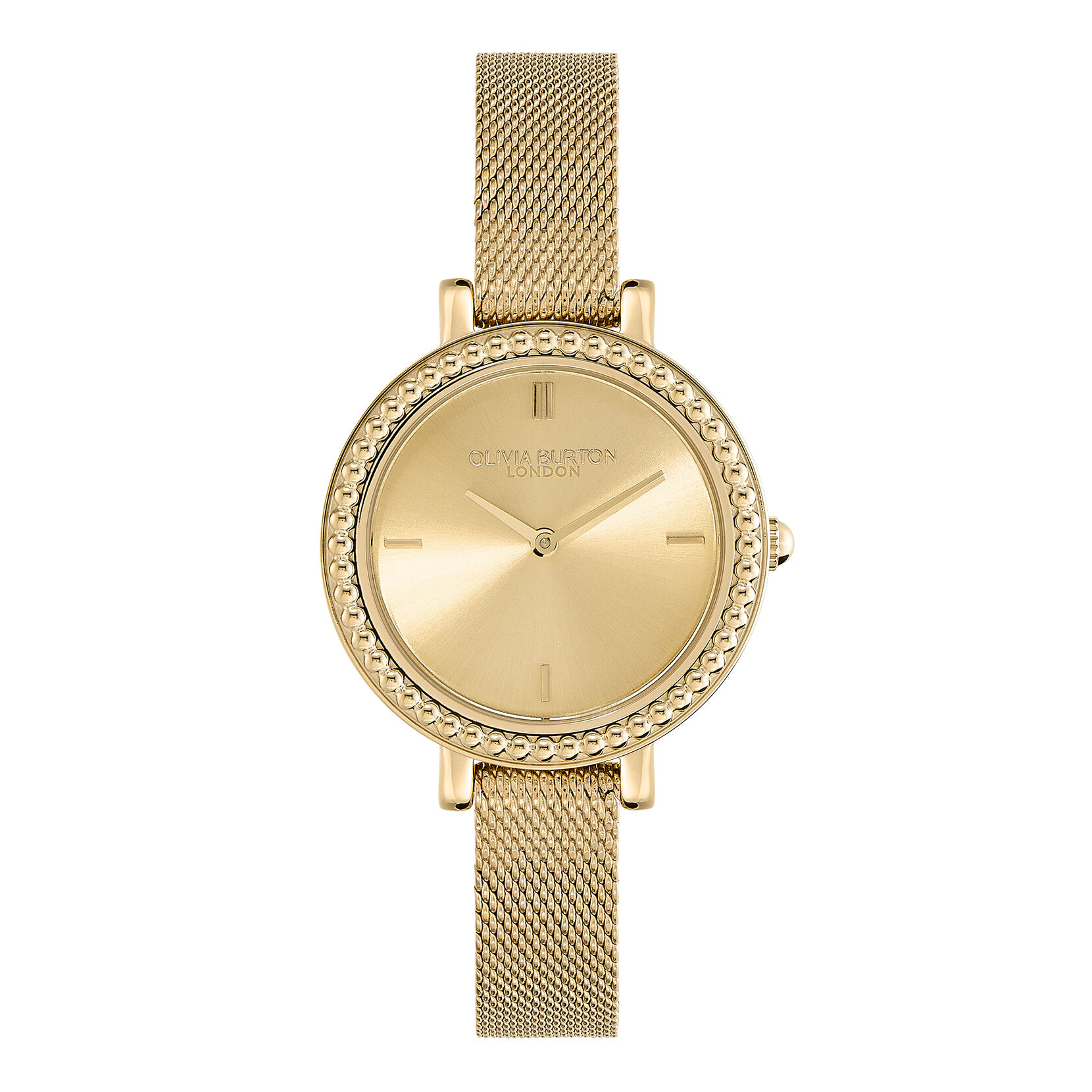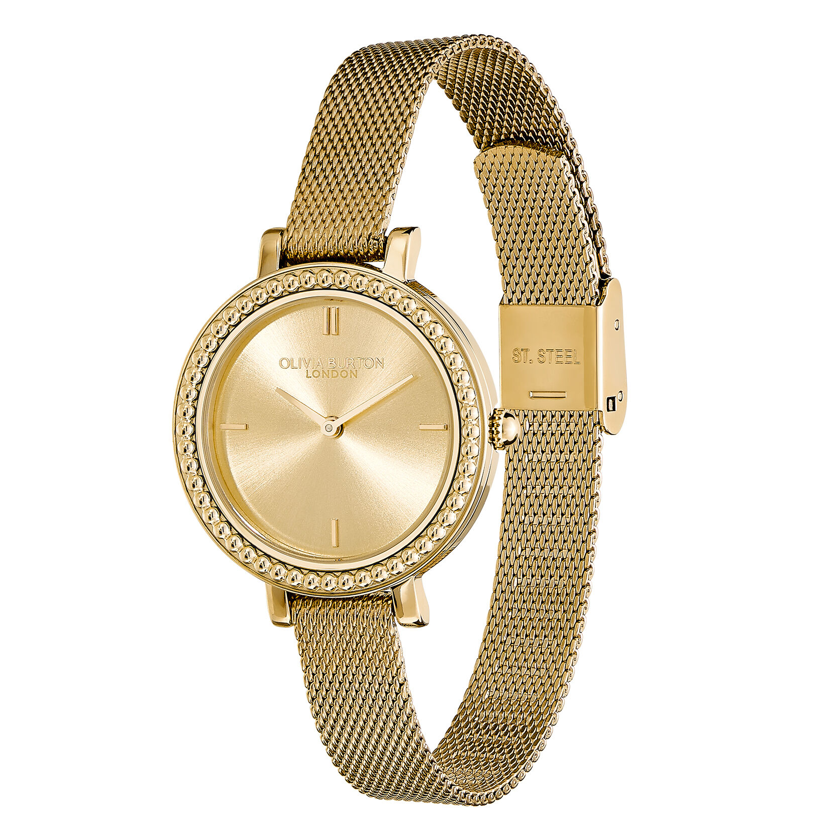 Modern meets classic with this vintage-inspired watch. Delicate gold plated beading influenced by Art Deco design encircles a contemporary light gold sunray dial.Finished with minimal markers and a mesh strap in a gold finish, it’s a fusion of old and new that we can’t get enough of.