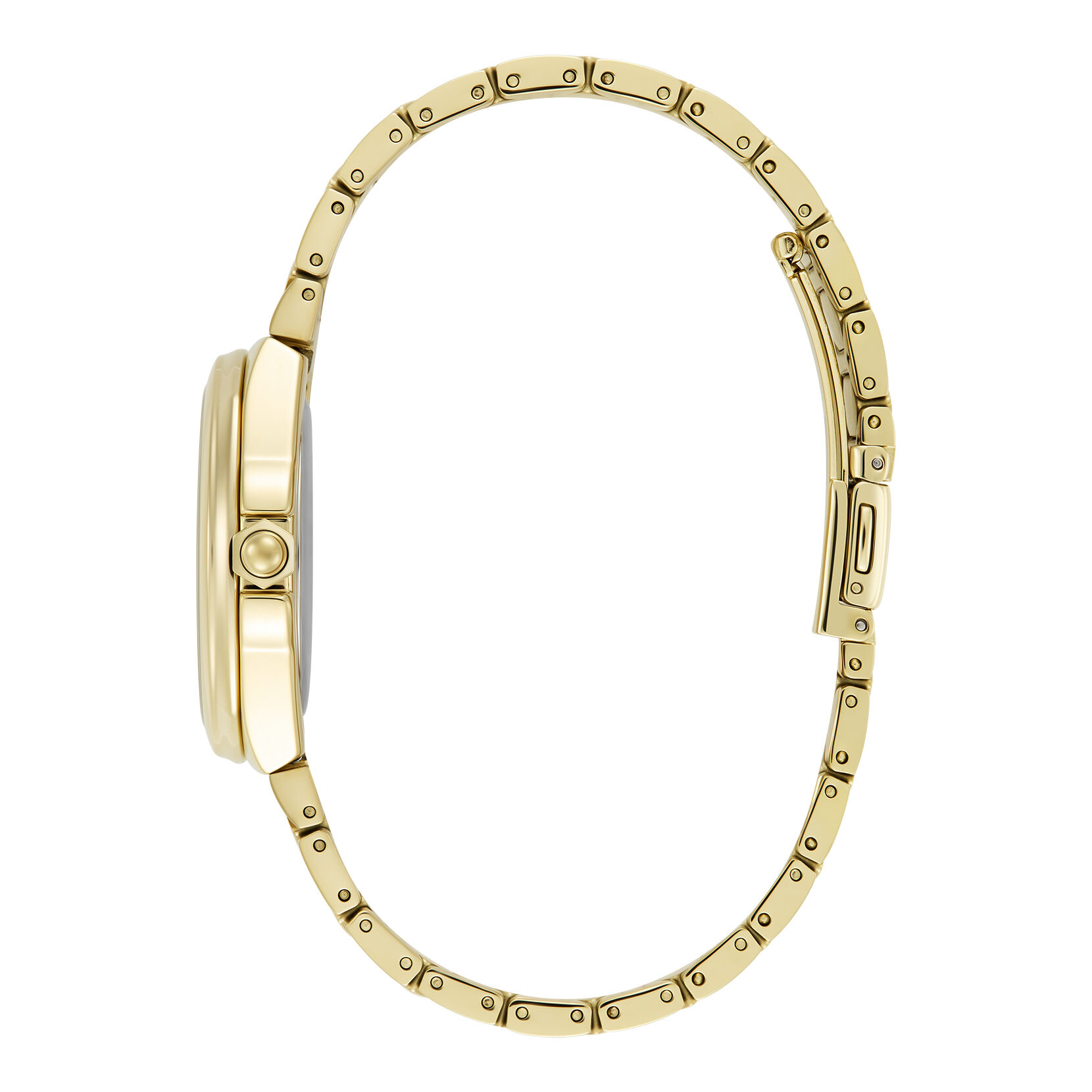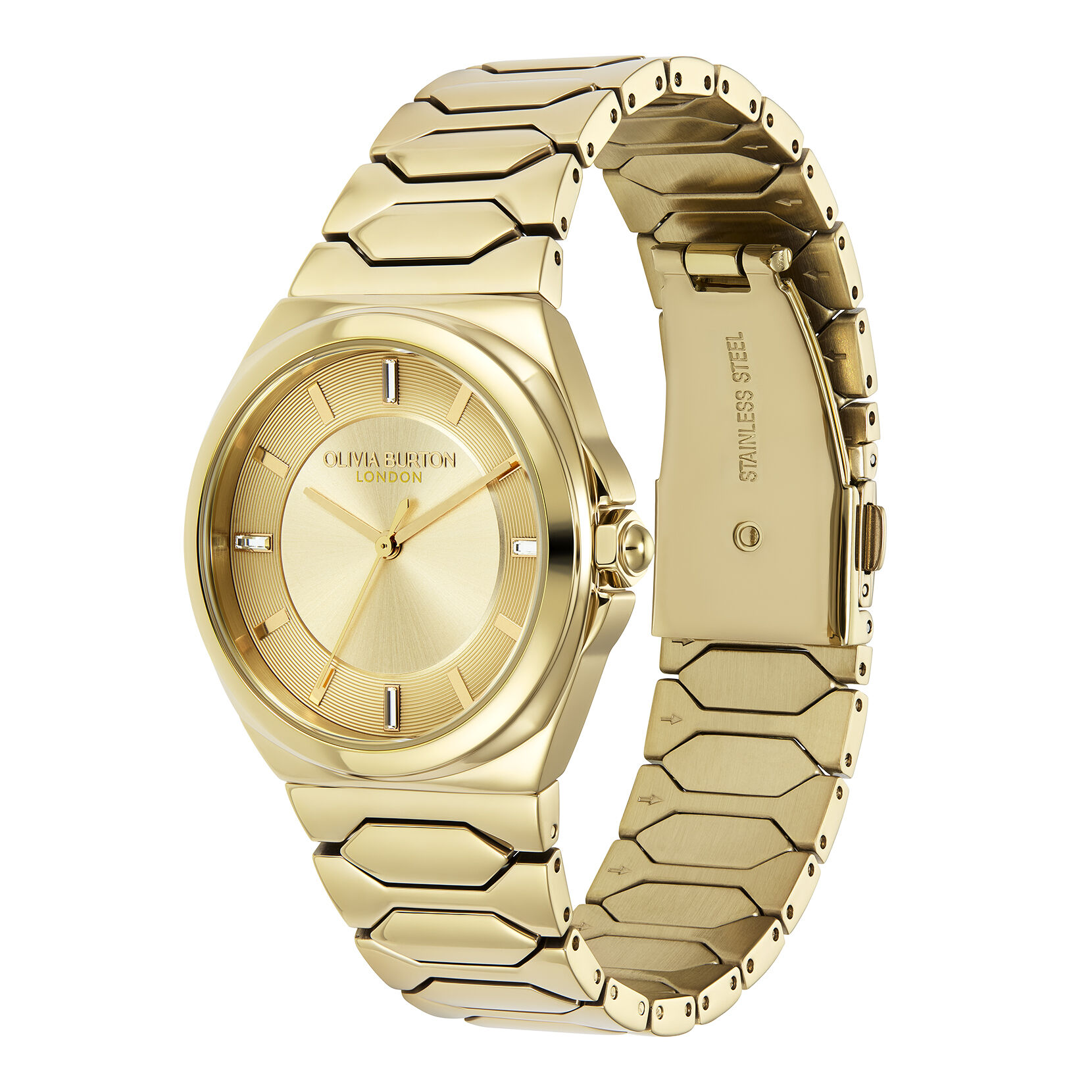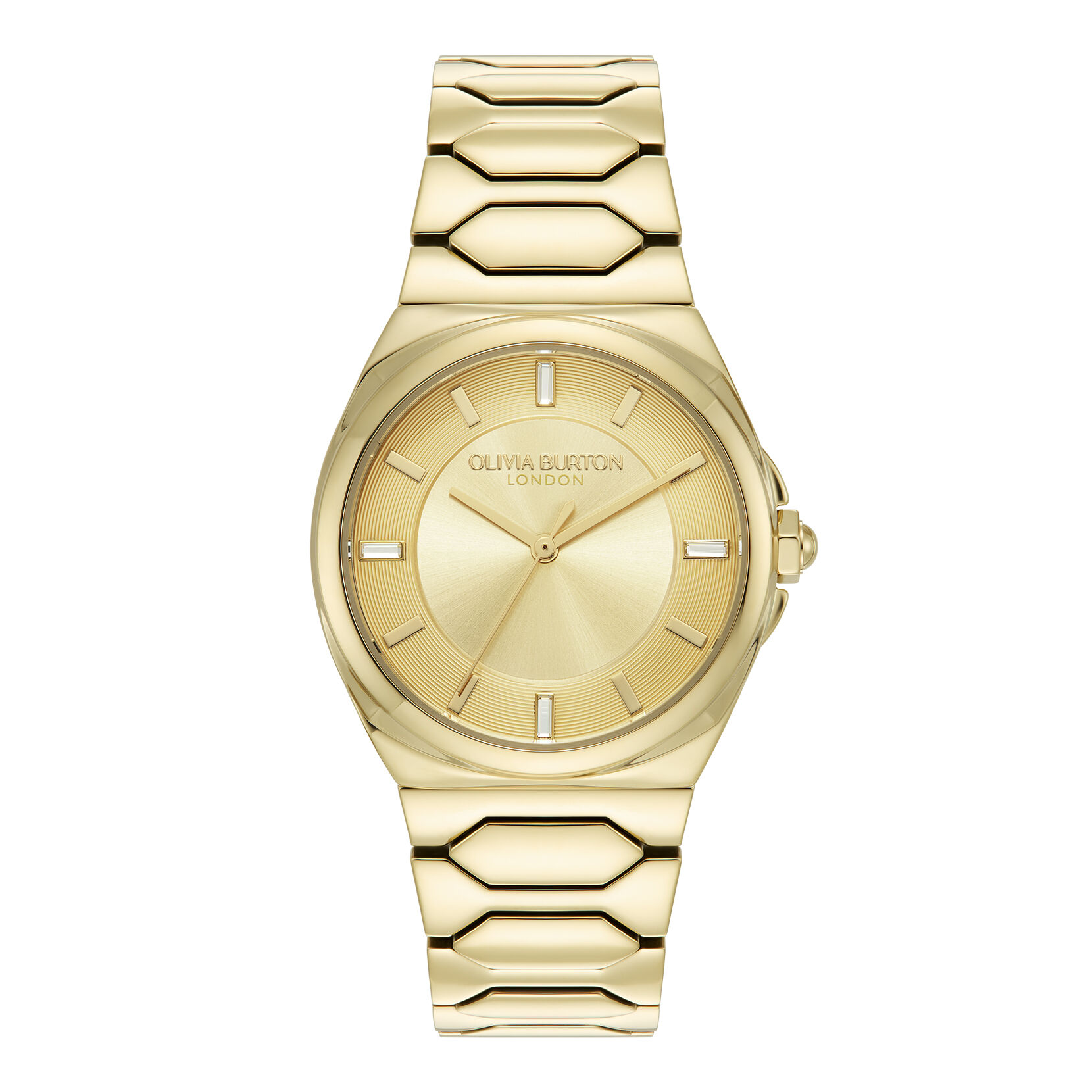 The Lustre collection celebrates the dramatic beauty of the honeycomb. Hexagonal links form a sleek gold-plated bracelet strap blending seamlessly into a sports-inspired case. The intricate sunray dial in pretty Champagne features contrasting soleil brushing and crystal baguette markers for an elevated feel. This radiant sports luxe style makes a statement every time.