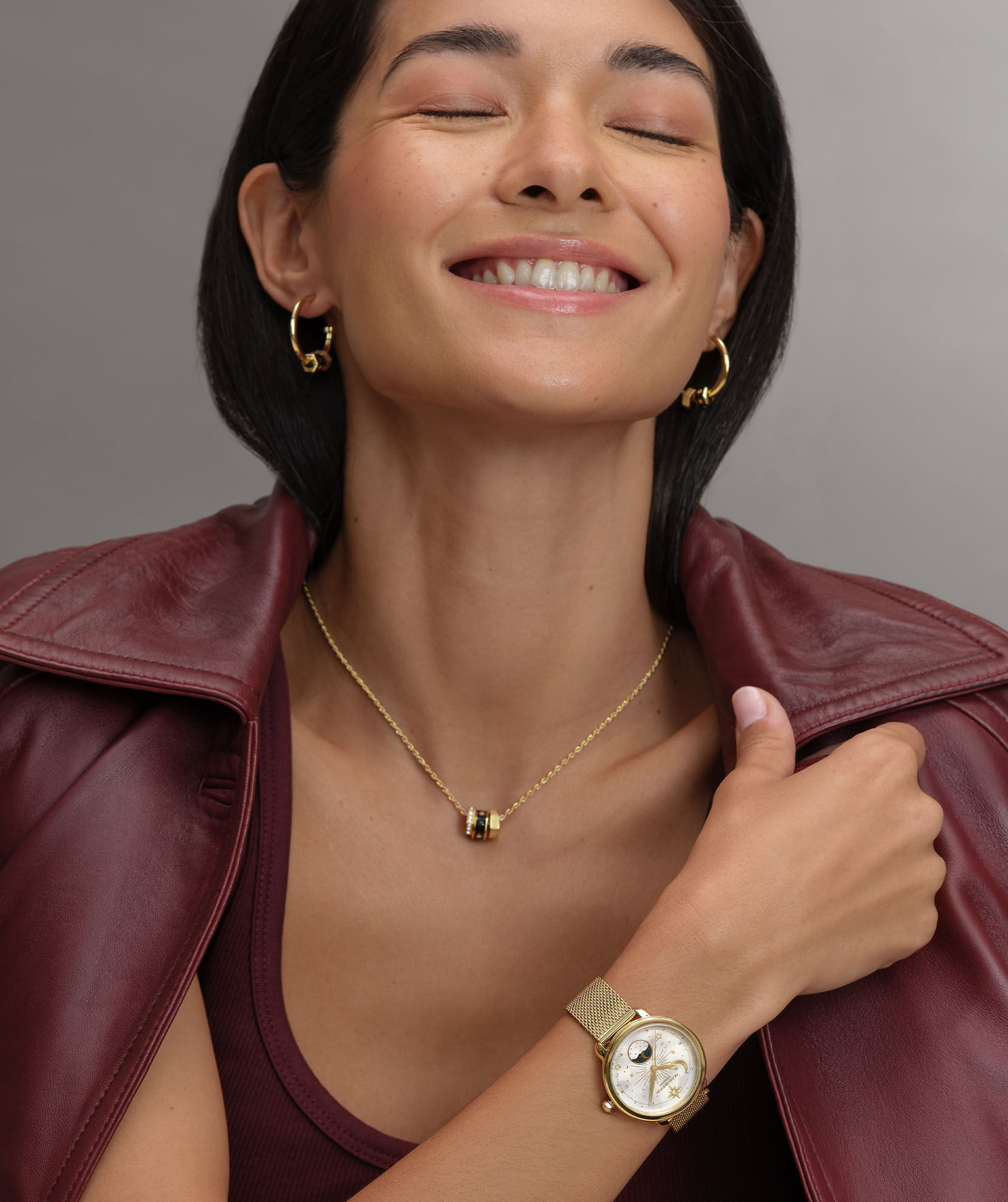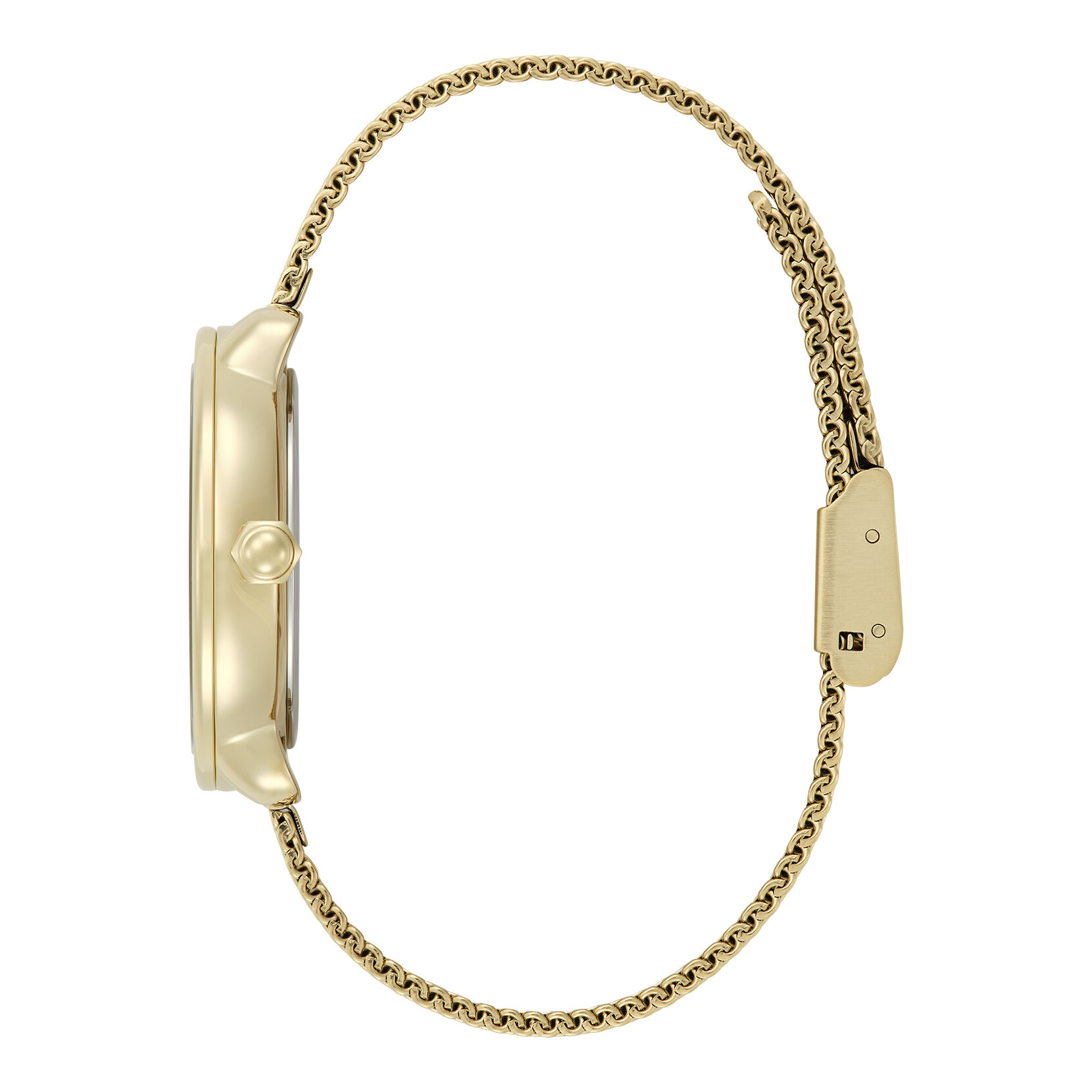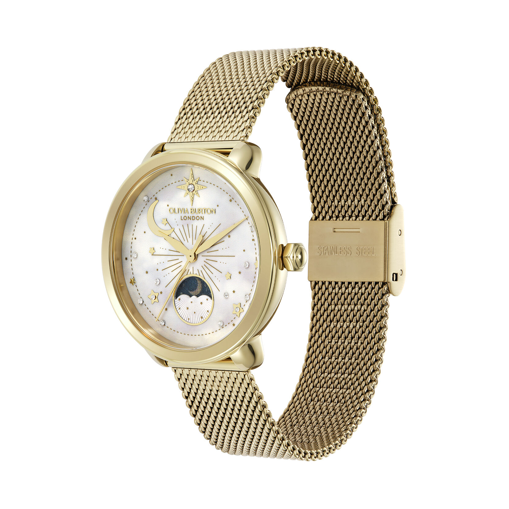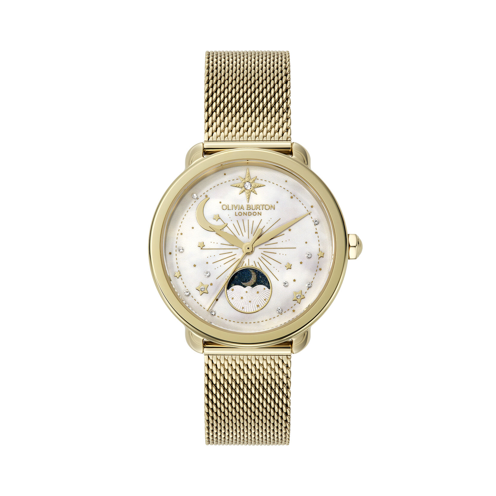 Our astrology-inspired watch celebrates the beauty of the night sky. The pearlescent White dial features our signature North Star marker and a sky of stunning crystal stars. Including a dial within a dial, the sub-eye window changes from day to night with the passing of the hours. A sleek gold finish and contemporary mesh strap make this the perfect way to bring a little cosmic magic to your look.