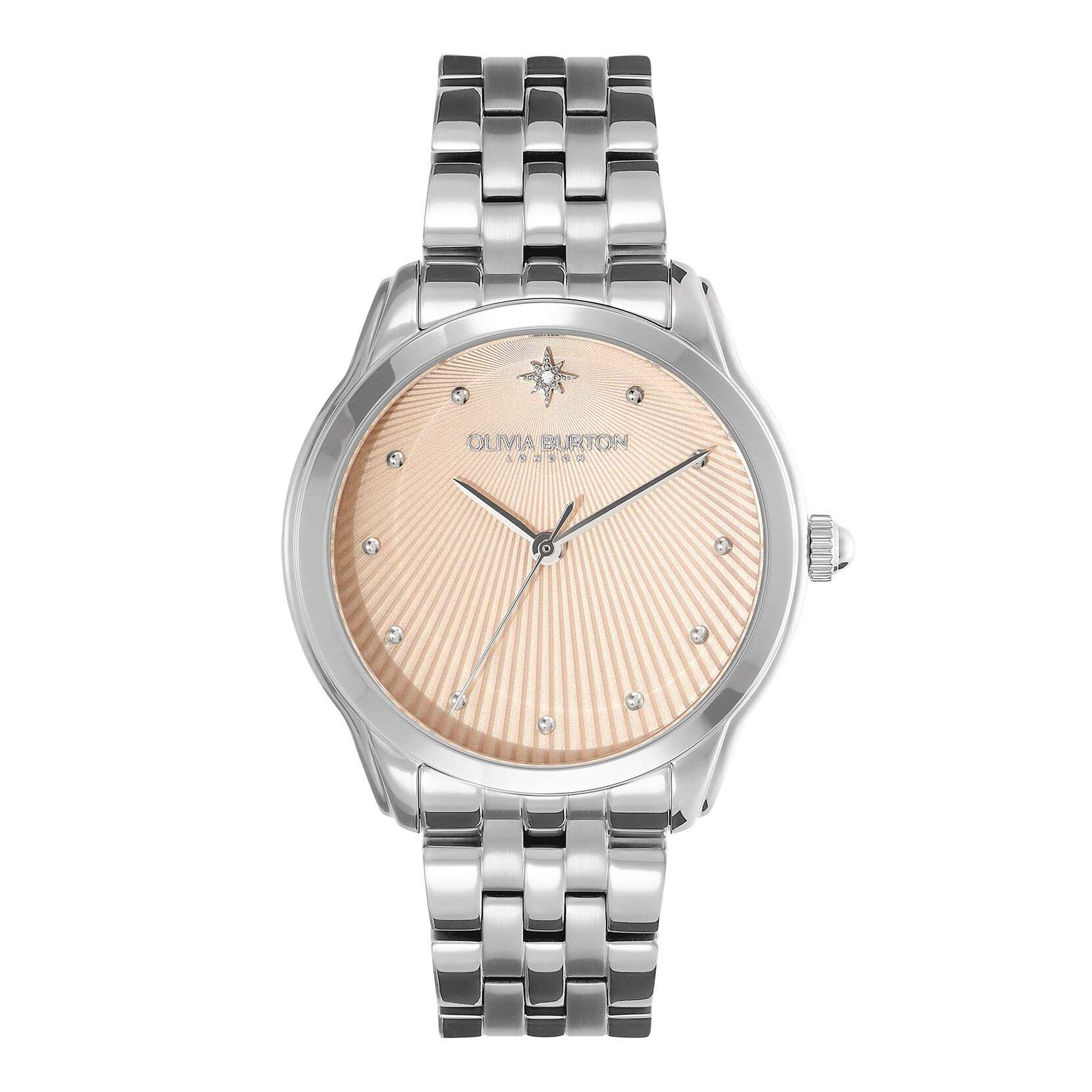 Inspired by star-filled skies, this Celestial Starlight watch features a dusk blush dial with a crystal-embellished North Star marker and luxe bracelet strap. Crafted from stainless steel and finished with intricate engravings that imitate beams of light, this piece serves as a reminder that the darkest nights make way for the brightest stars.